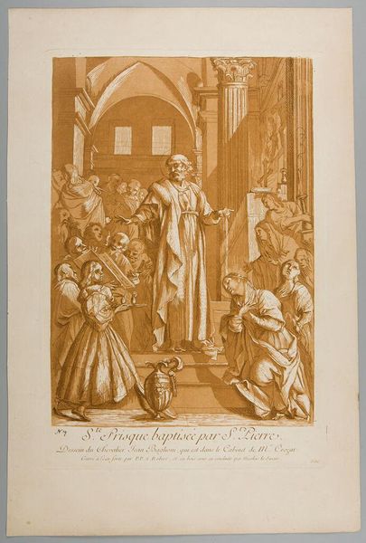 Curator: The work before us is by Paul-Ponce-Antoine Robert, depicting Saint Prisca being baptized by Saint Peter. Editor: Immediately, I'm struck by the dramatic use of light and shadow—it creates a real sense of depth and movement, even in this relatively small print. Curator: Baptism, of course, is a profound symbolic act—rebirth, purification, and acceptance into a new community. Note how Peter's gesture links him to both Prisca and the crowd of onlookers, reinforcing that communal aspect. Editor: The composition is quite masterful, too. The architectural elements—the arches and columns—frame the figures, drawing our eye to the central action, while the fluid lines add to that feeling of motion. Curator: Robert captures a pivotal moment in early Christian history, reflecting the power of faith and conversion through the representation of Saint Prisca's willingness to embrace a new belief system. Editor: It's fascinating how he manages to convey so much emotion and narrative with such simple lines and shading. It invites us to consider the transformative power of both faith and art.