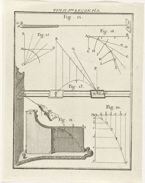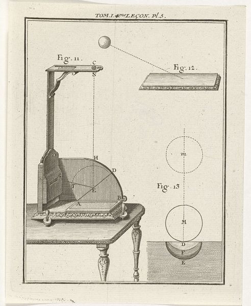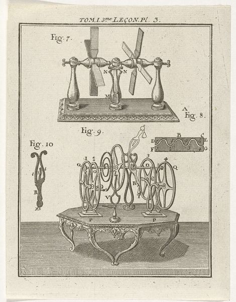 Curator: What a fascinating image! This engraving, titled "Natuurkundige instrumenten en modellen" or "Scientific instruments and models", comes to us from 1759 and is housed here at the Rijksmuseum. The engraver is Nicolaas van Frankendaal. Editor: Immediately, I'm struck by the stark, almost sterile clarity. The monochromatic lines delineate complex forms, imbuing them with an air of detached, objective study. It feels very much a product of its time, doesn't it? Curator: Absolutely. The piece reveals much about the cultural reverence for empirical observation during the Enlightenment. We see symbols of the natural world, like the water pouring into the basin, juxtaposed against the perfect geometry of the circles and lines. Water, throughout art history, carries diverse meanings—purity, transformation, the subconscious… Editor: True, and here, the presence of water suggests a connection to classical notions of the elements, or perhaps alludes to specific hydraulic principles being examined. What do you make of the numerical and alphabetical labels superimposed onto the instruments? Curator: Those alphanumeric notations function as a kind of key, linking visual representations to specific textual explanations within the book for which this engraving served as an illustration. It’s a semiotic system within the image itself, isn't it? Editor: Yes, almost a visual taxonomy! The piece embodies a quest for order and understanding, reflective of Enlightenment values and the period’s fervent attempt to systemize knowledge. Even the crisp, almost mathematical lines are meant to project precision. Curator: I agree completely. Beyond the scientific diagrams, one could even read the plate as an allegory, water the origin of things, and human observation attempting to understand and organize it, echoing centuries of humanity struggling to understand their place in the grand scheme. Editor: Looking closely has revealed so many fascinating insights, especially thinking about how symbols resonate through centuries. Curator: Indeed. It really provides food for thought about how much has, and hasn't, changed in our human desire for understanding.