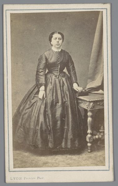 Editor: So this is "Portret van een onbekende jonge vrouw bij meubels," a gelatin silver print from between 1867 and 1880, by Willem Gerhardus Kuijer, housed at the Rijksmuseum. There’s a quietness to this portrait… a posed formality. How do you interpret this work? Curator: Immediately, I'm drawn to the performative nature of portraiture in this era. Notice the props: the table, the ornate chair hinted at in the background. These aren't just objects; they're signifiers of status and refinement. What does the austere gaze, juxtaposed against the domestic trappings, convey to you? Editor: Perhaps a sense of controlled strength, despite the confines of societal expectation? The way she firmly rests her hand, holding the book almost like a staff, communicates authority to me. Curator: Precisely. Consider, too, the stark contrast of the white bow against the dark dress. White often symbolizes purity, innocence, but here, its almost severe shape suggests something more deliberate, perhaps even a reclamation of agency within those constraints. Do you see any other symbols that resonate with you? Editor: I didn't notice the shadow next to her hand on the table initially! It creates the uncanny impression of a second mysterious figure in the scene... A doppelganger perhaps. That adds an entirely new perspective for me. Curator: Indeed. Photography at this time was evolving, embracing realism but still reliant on carefully constructed narratives. This shadow may indeed introduce an idea of interiority that conflicts with public persona, or a foreshadowing to the many cultural shifts and scientific theories during the same period that challenged our concept of identity. This photo holds multiple stories to tell, that we continue to read based on our own changing memories. Editor: I will never view another photograph the same way again. Curator: And I see this portrait with refreshed eyes as well, understanding how my experiences shapes what it brings to light today.