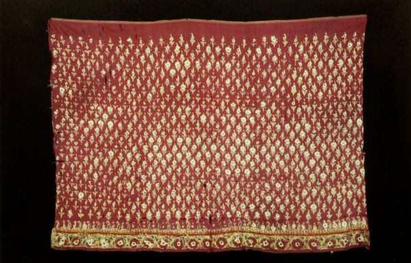 Curator: Welcome. Here we have a "Half Llklla (shawl)" created between 1960 and 1970. It's a remarkable example of Yampara textile art, currently residing here at the Minneapolis Institute of Art. Editor: My initial impression is one of quiet strength. The piece relies on these bold horizontal stripes of geometric patterns above this striking, solid dark mass. There's something deeply grounded about it, formal yet simple. Curator: Yes, Yampara textiles carry significant cultural weight. Llklla shawls like this one often signify status, community identity, and are integral to ceremonies and social life within the Yampara communities of the Andes. The geometric patterns aren't just decoration; they are narratives woven into the very fabric, telling stories of ancestral knowledge and the relationship between the people and their land. Editor: And these precise diamond motifs, meticulously repeated, create a subtle rhythm and reflect the care put into each individual stripe. The colors— the vibrant reds set against that grounding deep blue—further reinforce this feeling of both energy and stability. It speaks to an ordered way of thinking, carefully considered balance of contrasting features in its material being. Curator: Exactly. It's believed that the colors used also held specific meanings, possibly representing elements of nature or spiritual beliefs within the Yampara cosmology. The weaving techniques, passed down through generations, represent a profound connection to heritage and an act of cultural preservation. By choosing specific materials and using those intricate geometric patterns, the weaver asserted Yampara identity and resisted cultural assimilation. Editor: It's fascinating how something that, at first glance, appears quite simple can hold such layers of cultural meaning. The starkness, which I appreciated from a purely visual perspective, deepens considerably with the historical understanding you provide. It transforms my appreciation of it. Curator: And hopefully, the viewer’s too. Thinking about this shawl forces a dialogue between us and their communities’ past, it helps to acknowledge their struggles, as well as admire the exquisite beauty they chose to reflect in the process of maintaining these ancient cultural practices. Editor: A powerful testament to the communicative capability embedded within textiles, a voice woven with profound visual restraint and deeply imbued purpose.
