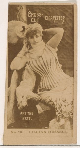 This is Card Number 86, Frankie Kemble, one of the Actors and Actresses series made by Duke Sons & Co. to promote Cross Cut Cigarettes. Framed within a rectangle, the composition is dominated by soft sepia tones. Notice how the figure of Frankie Kemble is rendered with a delicate balance of light and shadow. The artist's strategic use of chiaroscuro highlights her features, drawing the viewer's eye to her gaze. The softness of the sepia, combined with the gentle curves of her pose, evokes a sense of romanticism and nostalgia. Semiotically, the card functions on multiple levels. It's not just about selling cigarettes but also about selling an image, a lifestyle. The association of the actress with the brand creates a symbolic link, suggesting that consuming this product is akin to embracing the glamour and allure of the theater. The card destabilizes conventional portraiture by integrating it within a commercial framework. It’s an early example of how celebrity culture and advertising intertwine, reflecting changing perceptions of fame and consumerism.