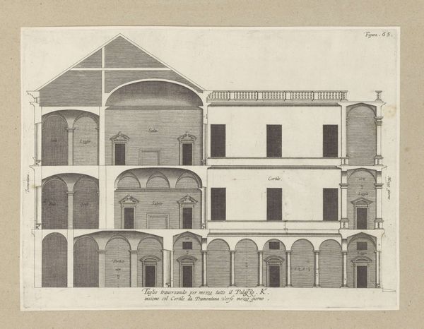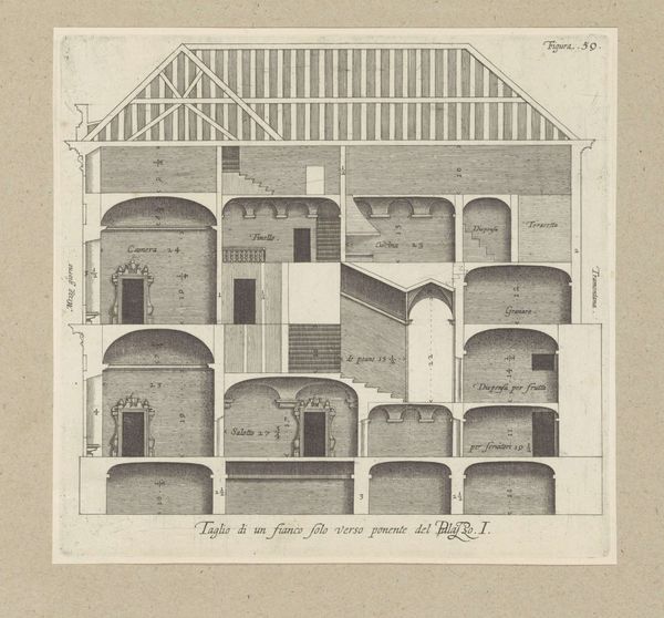 This is Nicolaes Ryckmans' 'Cross-section of the Villa Spinola di San Pietro in Genoa', made around the early 17th century. Ryckmans, a Flemish artist active in Italy, captures the architectural details of the Genoese villa through precise lines and geometric forms. The drawing offers more than a mere depiction of a building; it provides insight into the societal structures of the time. The Villa Spinola, owned by a powerful Genoese family, symbolizes wealth, status, and the consolidation of power within the aristocracy. Ryckmans' depiction of the Villa is clinical, yet it speaks volumes about the lives of those who inhabited and were excluded from such spaces. Consider how the design reflects not only aesthetic preferences but also the social hierarchies embedded in domestic life. How did the inhabitants traverse these spaces and how did this inform their identities? This cross-section invites us to reflect on the architecture as a stage for the performance of gender, class, and power in early modern Italy.