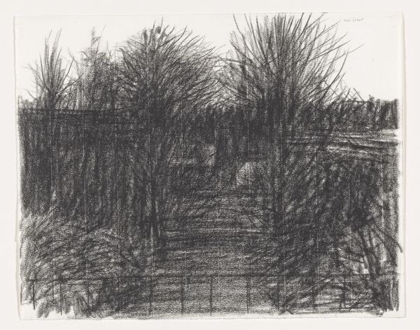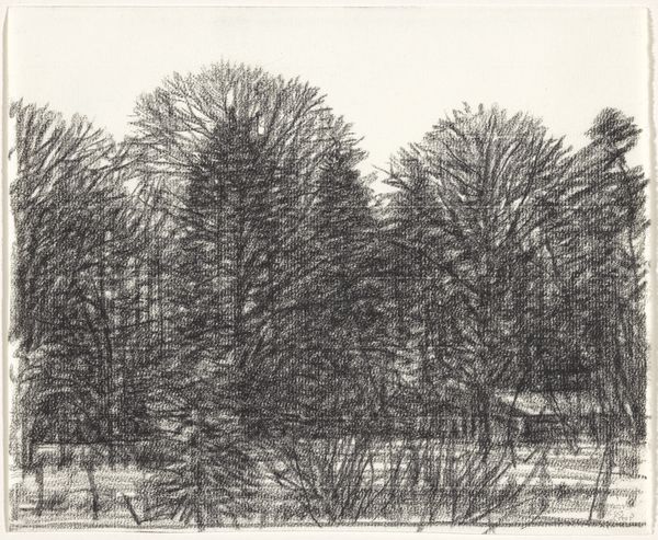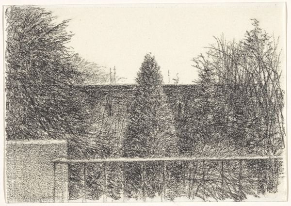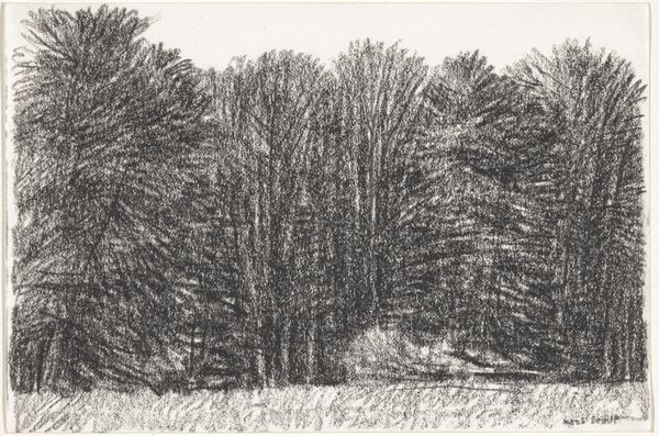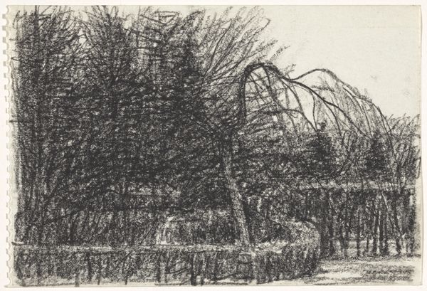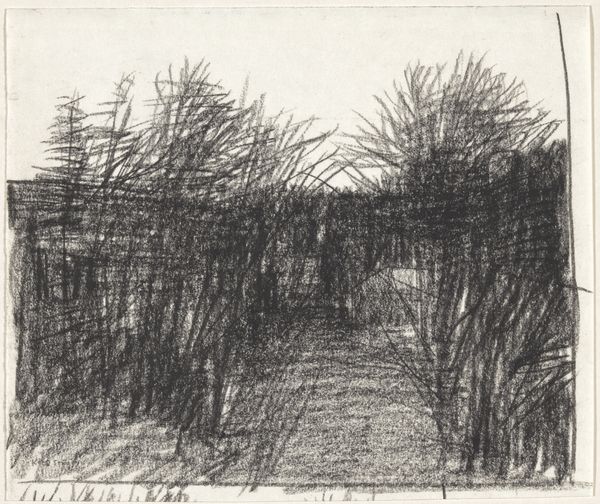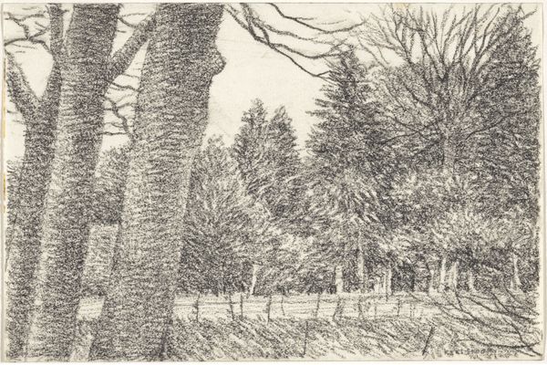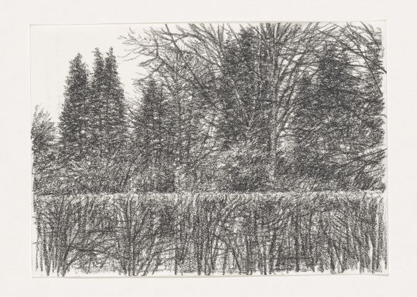 Curator: Let's talk about Kees Stoop’s “Bomenrij in veld en haag”, which roughly translates to "Row of Trees in Field and Hedge," created sometime between 1939 and 2009. What do you see? Editor: Hmm, a sort of brooding intimacy, almost claustrophobic despite being outdoors. It's the texture—that heavy, insistent pencil. Gives everything a muted, almost mournful feeling. Curator: It's definitely the application of pencil that pulls us in. Stoop seems less interested in capturing precise botanical details and more invested in the methodical, almost industrial, accumulation of graphite. It pushes past representation into something almost… tactile. You want to run your fingers across the paper. Editor: Exactly! And the implied labor is interesting too. Look at how repetitive it is! Like agricultural work. You could compare this kind of drawing practice to weaving or sowing seeds – an accumulation of simple marks repeated over and over, very disciplined work. What kind of paper is this, do you know? Curator: It's just paper—nothing particularly remarkable about it, which keeps the focus tightly on the process itself and on Stoop's engagement with form. See how the dark, almost uniform columns of the trees frame a light at the far end? I wonder what kind of scene do you envision at the end of this journey through nature? Editor: The geometric forms you mention—the way he forces unruly nature into regimented rows feels…controlled, somehow. Was Stoop commenting on humankind’s tendency to tame the wild? You think about industrialization, forestry as a commodity, these kind of issues must’ve been around when Stoop made this. Curator: He’s definitely showing us the artifice of perspective and arrangement within this rural scene, rather than just offering a simple "snapshot" of nature. His way of working offers an intimacy in landscape art and evokes contemplation. Editor: Yes, exactly! So, ultimately, it's not about the *what*—trees and hedges—but the *how*. The methodical build-up of material and Stoop's focused physical commitment leaves us more fulfilled and contemplative as a result. Curator: Ultimately, it's an illustration in balance and precision. I would agree! A compelling encounter between thought, method, and natural form that lingers in memory, I believe.