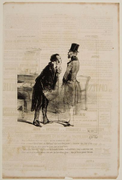 Editor: This print by Paul Gavarni, titled "He had thought he was playing a trick on me in taking Juliette from me . . .", depicts two men in what appears to be a tense encounter. What social dynamics do you see at play here? Curator: I'm immediately struck by the assertion of masculine identity, challenged perhaps. Gavarni was working in a time of shifting social mores. How might this image speak to anxieties around class, gender, and power during that period? Is this bravado or something more fragile? Editor: It does seem like a performance of masculinity. I hadn't thought about it in terms of power dynamics but it is clear there is a power struggle happening. Curator: Exactly. By examining the historical context, we reveal potential commentary on the evolving roles of men and women and the social expectations of the time. What a rich tapestry!