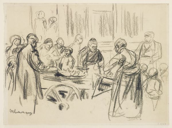 Curator: This is Jean-Louis Forain’s etching, "The Prisoner and the Child," from 1909. It’s rendered in a rather sparse, sketch-like style. What stands out to you? Editor: The palpable atmosphere. There's a somber, unsettling feeling created by the rapid, almost frantic lines. You can almost feel the scratch of the etching needle. Curator: Absolutely. The image depicts a prisoner sitting in what appears to be a courtroom or holding cell, while a woman holds up a child for him to see. Forain was deeply interested in portraying scenes of social realism and modern life, capturing the emotions of his subjects. Note how the eyes are central for each figure. Editor: The material realities strike me as poignant here. Think about the zinc or copper plate itself—scarred and worked over, much like the lives represented. Etching, a relatively accessible printmaking method, made it possible to circulate these images widely, influencing public opinion on poverty, law, and social structures. And consider Forain's labor, physically pressing into the metal. Curator: It does feel immediate and raw. The composition is deliberate in highlighting emotional relationships. Forain used images, frequently of downtrodden mothers and children, to generate very strong emotional reactions that bypassed political discourse, which can be a dangerous shortcut for real change. Do you think his images are effective or manipulative? Editor: Well, art's always both, isn't it? It's potent, this focus on vulnerable subjects reproduced through accessible, laborious means. I'm just wary of artists who romanticize and profit from subjects like prisoners, mothers and children. Did the printing process translate into better lives for any of these sitters? Probably not. Curator: That said, Forain offers an interesting, perhaps disturbing, meditation on redemption through familial ties and the universal suffering inherent in human existence. We cannot divorce it from it's own production of course, nor deny it's potential manipulative undertones. Editor: True, considering this work has deepened my awareness of the relationship between art making and social justice. It’s made me reflect on how accessible modes of creation impact visibility and perpetuate meaning, intentionally or not.