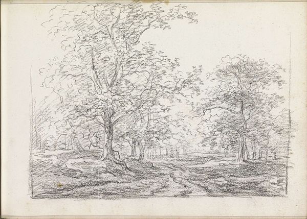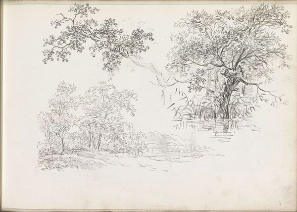 Curator: Immediately striking. It's like a whispered secret of a landscape. Editor: Indeed. This is "Bospad en bomen", or "Woodland Path and Trees", a pencil drawing dating from around 1811 by Andreas Schelfhout. It's currently held here at the Rijksmuseum. What draws you in so intently? Curator: There's a raw vulnerability in the pencil strokes. Look how Schelfhout renders the leaves, almost a feverish energy, yet held within the calm composure of the composition. I wonder what was happening in his life? It feels both peaceful and frantic. Does that make sense? Editor: Perfectly. And artistically of that time. Schelfhout, we should remember, was working during a period when the Romantics were very interested in the raw, untamed power of nature, contrasting it with the burgeoning industrial age. What appears simple and peaceful on the surface could also reflect this inner tension. Curator: I find it clever how Schelfhout uses these bordered views into the scenery. Is this an emerging style, or an intimate glimpse into Schelfhout's process? Editor: That’s a terrific observation. The distinct panels you noted may well indicate that these were preliminary studies, not intended as a finished work per se, rather components of the artist's preparatory exploration. We can even observe different areas are more detailed than others, indicating particular emphasis. Curator: It makes you think about the role of art itself, doesn’t it? A sketch like this reveals how much of art happens *before* the "artwork" is completed. How much intention remains invisible. Editor: Absolutely, it pulls back the curtain on the creative process. Seeing it exhibited here, presented as "art," shifts our understanding. It also compels us to consider art institutions; galleries often dictate the values or definitions of artistic merit by conferring value. Curator: I suppose that means our job here is to look deeper! Well, this has definitely reshaped my perception, urging me to contemplate unseen artistic labor in a social and historic frame. Thanks! Editor: A pleasure. And perhaps it encourages our visitors to carry a more appreciative eye when next wandering, even into nature itself.