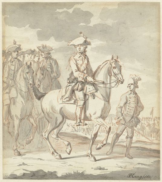 Editor: This drawing, "Military Parade" by Constantin Guys, created with pencil, presents a bustling cityscape scene. It’s quite striking how he captures movement with such simple means. What stands out to you? Curator: I see an articulation of power relations rendered through the very act of drawing itself. Note the pressure of the pencil: where is it heaviest? What does that signify about the figures being depicted and the implied societal structures upholding their authority? How are the raw materials employed – the graphite, the paper – contributing to the overall message about class and militarization? Editor: That’s interesting. I hadn’t really thought about the pencil strokes themselves as a way of reinforcing power. The figures on horseback are definitely rendered with bolder strokes than the background. What about the fact that it's a drawing and not, say, a painting? Does the "sketchiness" affect your interpretation? Curator: Absolutely. Drawing is immediate. It's linked to labor. Think of the ready availability of paper and pencil compared to oil paints in Guys' era, and the type of patron who would typically commission each medium. Does the relative affordability of creating a drawing, like this, versus the expense associated with producing a history painting democratize this imagery somehow, even when representing hierarchical themes? Or does it reinforce those very same social differences? What do you think? Editor: I suppose it depends on who has access to the image and its circulation. So even something as simple as a pencil drawing can speak to larger issues of class and access? Curator: Exactly. Every mark, every material choice reflects the socioeconomic realities in which the artwork was conceived and consumed. It urges us to look beyond just the ‘subject’ of the military parade and interrogate its means of production and potential audience. Editor: That gives me a totally new way of thinking about art! Thanks!