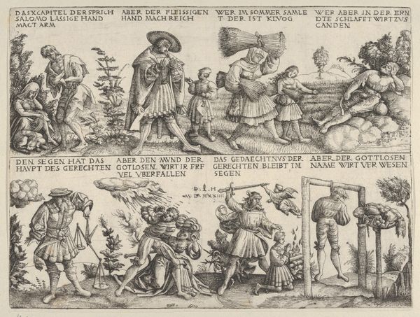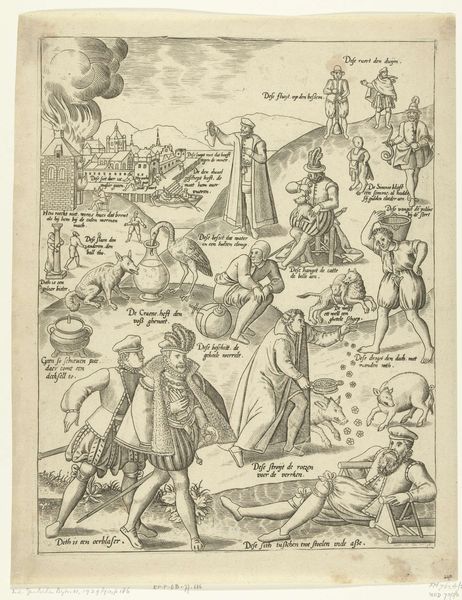 Editor: This is "Hoe de helden van Waert een dode rog bestrijden," or "How the Heroes of Waert Fight a Dead Ray," made around the early 1600s, probably an engraving. The first thing that strikes me is the incredibly detailed line work, capturing so much frantic energy. What compositional elements stand out to you? Curator: The emphasis, decidedly, is on the arrangement of forms and the intricate web of lines that compose them. The scene is busy, undeniably, but note how the artist uses line weight to direct the eye. Thicker, darker lines define the figures in the foreground, particularly the men wielding spears. Editor: Yes, the linework seems to almost vibrate with motion. I’m drawn to the... strange... placement of the ray itself. Curator: Indeed. Semiotically, the ray takes a privileged position as the axis. Observe the structural contrast created by its prominent position relative to the adjacent group centered around the cannon; its radiating lines diverge into the visual density, where meaning perhaps becomes even more polysemic. Editor: Polysemic? Do you mean many layered and perhaps conflicting? Curator: Precisely. It underscores the formal disjunction at the work's core. The figures are rendered with precision and attention, yes, yet integrated into a flattened pictorial space that pushes against representational norms. A rupture occurs, of sorts. It appears hyperreal while it struggles to render perspectival coherence, yielding narrative opportunities. Editor: The background is very flat. And the eye bounces around without landing anywhere specific. Curator: Quite. That tension, between detailed rendering and compositional flattening, constitutes, for me, the artwork's generative principle. The very visual activity speaks for a mode of thinking. Editor: I never thought of that. Now I see it! Thanks, I appreciate your perspective on the composition. Curator: An acute observation. I trust you continue to reflect on the material components within the artwork's semiotic context and form.