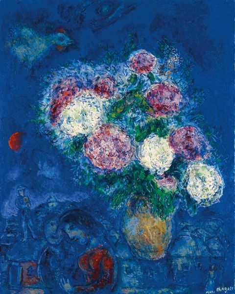 This is Chagall's 'Vase de Roses' and it looks like it was made with oil paint. Look at the way he builds up the image with layers, like he’s feeling his way through a garden. I'm drawn to the thick, almost mossy texture of the green foliage; it's a whole world of little marks. The color feels pulled from a dream, a memory, not exactly how roses look, but how they *feel*. Then, bam! There's that cobalt blue vase. It’s like a solid anchor amidst all this dreamy foliage. A solid block in a dream. And down at the bottom, there are more dream figures! The painting isn’t just about the flowers; it's about love, memory, and maybe even a little bit of longing. It reminds me of Odilon Redon, another painter who wasn't afraid to dive headfirst into the world of imagination. Art isn't about answers; it's about the questions we ask along the way.