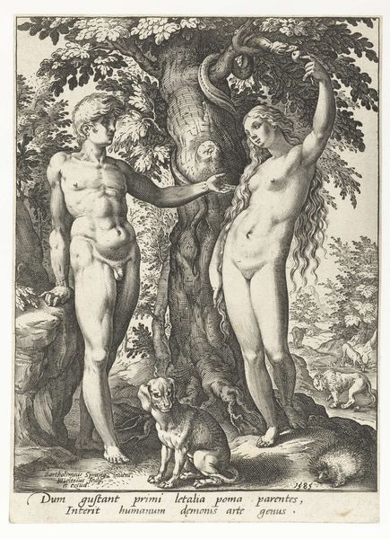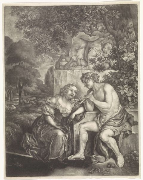 Jacob Matham created this engraving, Hercules en Deïanira, in the late 16th or early 17th century. During Matham's lifetime, the Dutch Republic was in the midst of its Golden Age, a period marked by economic prosperity, artistic innovation, and intellectual exchange. Here, Matham depicts a moment of intimacy between Hercules, the celebrated hero of classical mythology, and his wife Deianira. The work presents a highly idealized view of the human form, reflecting the Renaissance interest in classical aesthetics. Hercules' muscular physique embodies masculine strength, while Deianira’s pose and expression are more demure. What does it mean to portray a woman in mythology as reserved compared to her strong, male counterpart? Matham's choice of subject and style reflects the cultural values of his time. Although he worked within the traditional norms of representing classical narratives, his technical skill as an engraver allowed him to bring a new level of detail and emotion to the story. This piece invites us to think about how artists negotiate their identities and express themselves within existing cultural frameworks.