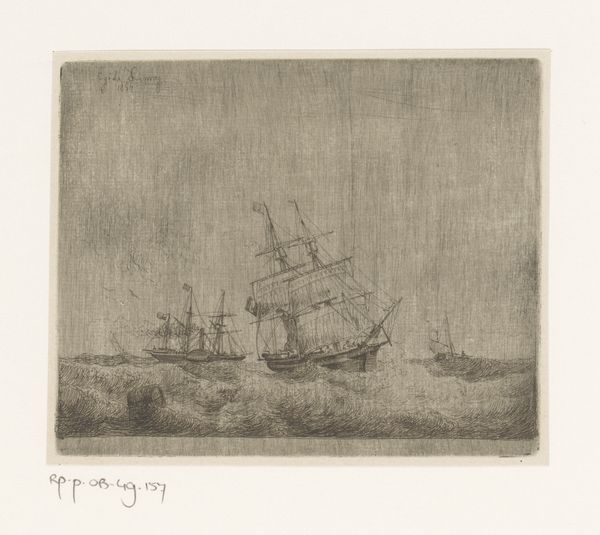 Editor: This etching from 1854, "Zeilschepen en een raderstoomschip op zee," by Egidius Linnig, has such a turbulent feel to it. The ships are really struggling in the waves. What visual stories and connections to the cultural memory do you see here? Curator: Immediately, the composition invokes a feeling of man's struggle against nature, a common Romantic trope. But more subtly, the presence of both sailing ships and the raderstoomschip – a paddle steamer – hints at a moment of technological transition. What feelings are evoked when you think about this mix of the old and new? Editor: That's interesting – a sense of progress, but also maybe a loss of something? The steamer is smaller, almost overwhelmed. Curator: Precisely! Consider how the billowing sails of the larger ship, symbols of exploration and trade, contrast with the more mechanically driven steamer. What emotions might this juxtaposition have stirred in viewers of the time? The ship tilting against the large swells evokes feelings of fear. What do the swells remind you of? Editor: It does feel like they're on the verge of capsizing! It's so dramatic. They remind me of huge monsters! Is this why viewers would buy images of storms? To evoke intense feelings? Curator: Perhaps it was a way to contemplate nature's power and, by extension, their own place within it. Think of these prints as not just depictions of events, but reflections of a society grappling with its identity and its future, playing out against the grand backdrop of the sea. Editor: That’s a much deeper dive than I expected! It is more than a technical drawing, it is a complex depiction of cultural changes. Curator: Indeed. Art so often reflects the undercurrents of its time, presenting an emotional map of our shared anxieties and aspirations. We see these shifts visually using the imagery.