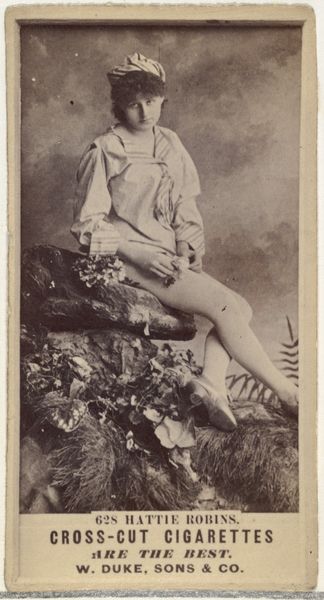 Editor: This is "Card Number 169, Fannie Milton," an 1880s photograph, drawing and print combination promoting Cameo Cigarettes. The subject's theatrical pose is what strikes me most; it's a bold choice. What's your perspective on this piece? Curator: Indeed. Consider how the composition uses the figure to interrupt the implied grid formed by the faux-stone platform. The subject's off-center gaze disrupts a predictable reading. Editor: I see what you mean. So you're focusing on the way the subject and background play against each other structurally. Curator: Precisely. The textures also present an intriguing dialogue: the faux fur juxtaposed with the hard edges of the blocks, and the contrast between soft flesh and constructed surfaces. The monochromatic palette serves to flatten and emphasize these contrasts. The almost cartoonish pose is itself a key to appreciating its graphic flatness, thereby eschewing photorealistic aims. Do you observe the figure's hand gesture in relationship to her eyes? Editor: Yes! It mirrors it, echoing her gaze. It gives it such dynamism, a sense of activity, while also remaining flat on the picture plane. I hadn't considered how significant that was. Curator: Yes, precisely. Formally, the gesture generates significant depth through subtle echoing. It also hints to her vocation, namely theater. Such an example embodies key principles of Formalism in how closely visual cues and structures point to implied meaning. Editor: That is incredible. Seeing how interconnected all these details are, revealing themselves through visual inspection. Thank you for opening my eyes! Curator: You're welcome. Now, go forward and decode more!