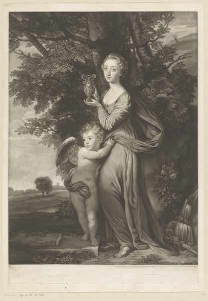 This mezzotint, "Portrait of Polly Harrison with a Dove in her Hand," was created by Valentine Green, a leading printmaker in 18th-century Britain. The image presents a young woman in an idealized, pastoral setting, holding a dove, a symbol often associated with peace and innocence. In Britain, this kind of imagery played a crucial role in shaping social ideals and norms. Aristocratic families often commissioned portraits that presented them as virtuous and refined. By controlling their public image, the elite reinforced their social standing and cultural authority. Mezzotints like this one, with their subtle gradations of tone, were prized for their ability to capture the textures and details of such paintings. Engravings such as this one circulated widely. Art historians study the distribution of such prints to understand the evolving tastes and values of the British middle and upper classes, and to explore the public role of art in shaping cultural identity.