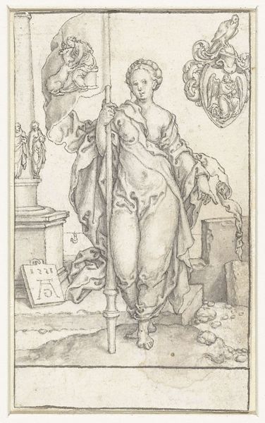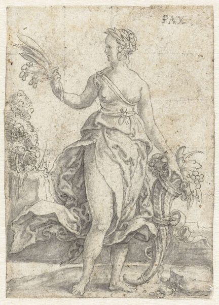 Editor: Here we have Heinrich Aldegrever's engraving, "Vrede," created in 1549. It shows a figure, likely a personification of peace, holding what looks like an olive branch. I'm struck by the precision of the lines and how the textures are rendered in this print. What stands out to you in terms of its creation? Curator: Looking at this engraving, I'm particularly interested in the materials and processes involved. Consider the labour: the skill required to transfer Aldegrever's artistic vision onto a metal plate using only lines and then multiply it through printing. It makes us reconsider what art could be during this era and who had access to its images, challenging notions of singular masterpiece and inviting multiple viewing experiences for different strata of society. Editor: That’s fascinating. So, instead of just admiring the image, you’re asking us to think about how this print circulated and its availability for the contemporary viewer? Curator: Exactly. Who owned it? How was it displayed? How did its relative affordability influence its reception compared to, say, a unique oil painting only accessible to an elite patron? The materiality of the print—the paper, the ink—speaks to its social function. The very act of engraving, of reproducible art, hints at a breakdown of established hierarchical artistic practices by allowing its access to different patrons and the population. Editor: So the choice of printmaking itself is significant, connecting to broader societal changes? Curator: Precisely. Consider how this multiplied image may challenge notions of artistic exclusivity and value by bringing images and ideas of ‘peace’ to broader audiences. A perfect blend of material exploration with meaningful visual commentary and a direct criticism of other traditional art production forms. Editor: I see what you mean. It changes the way I look at the artwork; it's not just an image, but evidence of its time. Thank you! Curator: Indeed. Thinking about art in terms of material processes enriches our understanding of its purpose and the forces surrounding it.