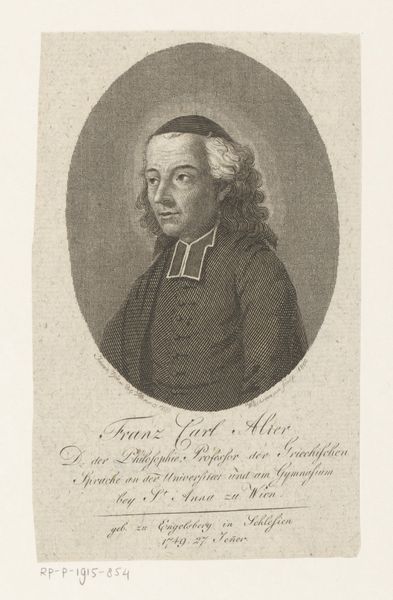 Editor: This is a print called "Portrait of Jean Sifrein Maury" by Jean Baptiste Vérité, created sometime between 1788 and 1805. It's an engraving, and I'm immediately struck by how formal and almost severe the portrait feels, despite the soft curves of the oval frame. What catches your eye when you look at it? Curator: Well, for me, this print whispers of revolution. Think about it – this man, Maury, was a prominent figure right on the cusp of monumental change in France. You see that steely gaze? Perhaps it holds a premonition, a subtle acknowledgement that the world as he knows it is about to be completely upended. Editor: Revolution, really? I was just seeing a pretty standard Neoclassical portrait. I hadn't considered that context. Curator: Absolutely! The clean lines, the controlled composition – all that’s textbook Neoclassicism, right? But contrast that with the unrest simmering beneath the surface of French society at the time. Does the somber tone hint at anything to you? It’s almost as if Vérité, the artist, captured a moment of poised tension before the storm broke. What is he trying to hide, or perhaps reveal, about his sitter? Editor: Now that you mention it, there’s a certain… seriousness about the piece that goes beyond mere formality. The way his eyes are cast... It makes me want to know more about Maury himself and how he navigated the revolution. I think I had him pegged all wrong. Curator: Precisely! It’s a wonderful reminder that art, even portraiture, is rarely just about appearances. It’s about the person, about power, and the era from which it sprang! It prompts us to see the bigger picture. Editor: This has really changed how I'll look at portraits from now on.
