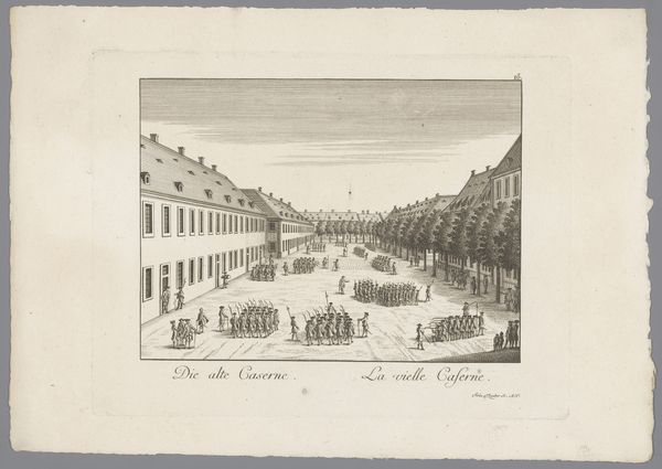 Curator: What a strangely calming perspective, looking down this perfectly ordered street. Almost clinical, in its precision. Editor: It’s a print dating back to 1782, entitled *Gezicht op de Breite Strasse, te Mannheim*, or *View of the Breite Strasse in Mannheim*, created by the Klauber brothers. They were engravers, so this meticulous rendering is very much their specialty. Curator: You can really see it—the careful linework. There's a wonderful quality to the light, too, even without color. It feels airy. Was Mannheim known for this particular... urban planning vibe? Editor: Absolutely. Mannheim was essentially rebuilt in the 18th century with a grid system. Think of it as an attempt to impose rationality and control onto the urban landscape, reflecting the Enlightenment ideals. The "broad street" was, therefore, both a literal and symbolic representation of progress and order. Curator: Order... right. It almost feels a bit *too* ordered, doesn't it? Like something’s missing, like...rebellion, perhaps? I’m itching to throw a splash of bright colors into the scene, just to wake it up. A protest march would fit nicely, a lovely contradiction in terms. Editor: Precisely. That tension is palpable. The print highlights a very specific ideal of civic life—organized, predictable, easily governed. But of course, that ideal often comes at the expense of individual expression, of spontaneous happenings, of the messiness of real life. Curator: Which artists have tried to portray. I guess that’s why a print like this, which so cleanly lays everything out, becomes oddly fascinating. Editor: Right, there’s the illusion of perfection presented within an imperfect reality. These streets aren't just thoroughfares; they represent power dynamics etched in stone. Curator: Leaving us with this quite exquisite etching—both lovely and subtly unsettling. Editor: A great reflection of a moment where urban planning aspired to perfect order, captured forever in ink.