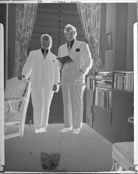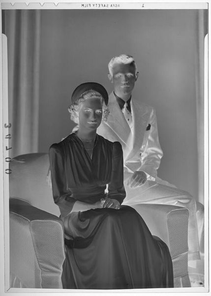 Editor: This is an untitled studio portrait by Martin Schweig. It’s a black and white photograph of a woman with a corsage and a man with a mustache. The negative effect gives it a ghostly, almost surreal quality. What strikes you about this image? Curator: The inversion of light and shadow is indeed striking. But I think it also highlights the performative nature of portraiture, especially in relation to gender and class. Look at the woman's corsage, the man's suit – they're symbols of a certain aspirational identity. What narratives do you think they're trying to construct? Editor: Perhaps they are presenting an image of success and sophistication in a society still dealing with issues of race and class? Curator: Precisely. Their careful presentation invites questions about power, representation, and the gaze, and how it plays into identity. It reveals a moment staged for posterity, but also for negotiation. I think it's a compelling reminder of the complexities embedded in seemingly simple images. Editor: I see it now, it makes you think about the story behind the people in the picture, not just what’s in front of you.