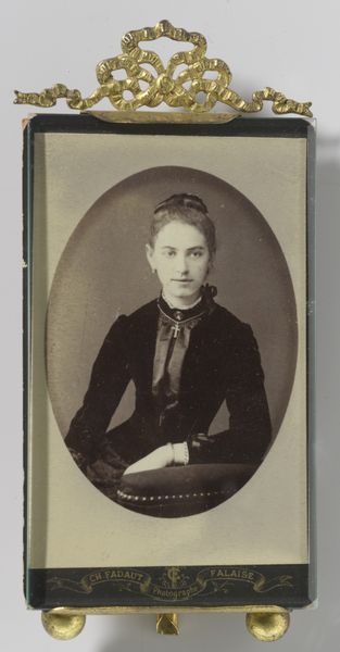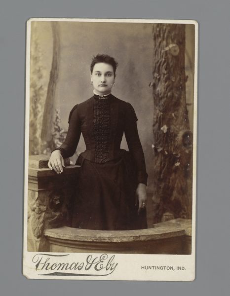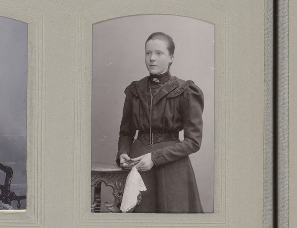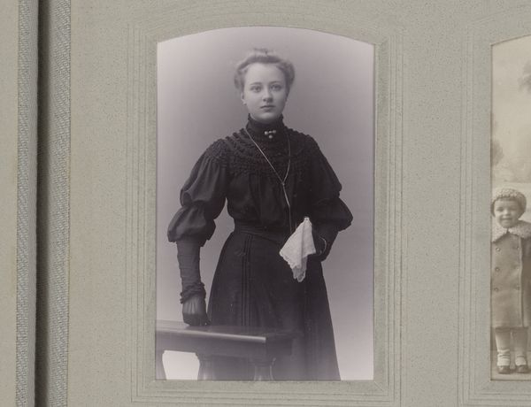 Editor: Here we have an intriguing photographic portrait by Karlsson & Bergström, dating from 1880 to 1920. It's titled "Portrait of a Standing Young Woman in a Black Dress with a Book and a White Handkerchief." I'm really drawn to the somber mood and the contrast between the dark dress and that crisp white handkerchief. What stands out to you? Curator: I'm immediately struck by the materiality. Let's consider the photograph itself – the paper, the chemical processes, the darkroom labour. What was the social context for portrait photography at this time? It wasn't ubiquitous, was it? Editor: No, not like today's instant snapshots. I imagine it was a more formal, deliberate process, reserved for certain classes or special occasions. Curator: Exactly. And notice the woman's dress. The fabric, the cut – those enormous sleeves! – speak volumes about the era's textile production, fashion consumption, and even class status. How might the industrial production of fabric impact fashion? How readily was it available? Editor: I hadn't thought about that. The Industrial Revolution meant that fabrics were more accessible and fashion changed faster, becoming a way to display wealth but also aspirational for a growing middle class. What about the book and handkerchief? Curator: Ah, potent symbols! The book speaks to literacy, education, and intellectual pursuits – activities becoming more available, but not to everyone. And the handkerchief, a small but telling detail. Its very presence whispers of cleanliness, refinement, even perhaps social anxieties. What materials might that be made from, and how were they processed? Lace was particularly expensive. Editor: I see, so even in something seemingly simple like this portrait, there's a whole world of social and material history embedded. The layers are deeper than I initially expected. Curator: Precisely. It forces us to consider how art is made, consumed, and how even a simple image reflects the economic and social forces at play.