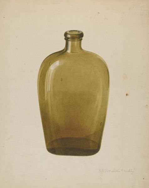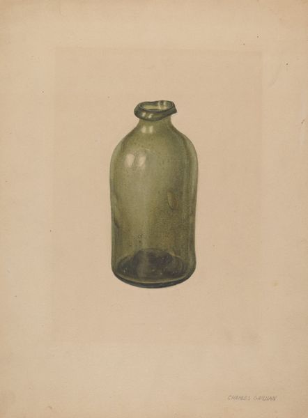 Editor: Here we have Alvin Shiren's watercolor and pencil drawing, "Gemel Bottle," created around 1937. It's quite delicate, almost fragile in its presentation, and that blue hue is captivating. What do you see when you look at this piece? Curator: It's more than just a bottle, isn't it? A "gemel bottle," traditionally, is a vessel made of two interconnected compartments, often given as a love token. Shiren painted this during a period when ideas around domesticity and gender roles were being renegotiated. Is Shiren playing with ideas of interconnectedness or perhaps even fractured unions through this seemingly simple depiction? Editor: That's a really interesting point, I was just seeing the still life of the transparent bottle. The “gemel” as a kind of gift…that makes me consider it in a different way. Curator: Think about it – why choose this particular object? Watercolors, with their transparency, further emphasize vulnerability. This bottle becomes a potent symbol when considered within a broader socio-political lens, speaking perhaps to the precarity of relationships in a changing world. What kind of commentary might it offer about relationships from the male perspective? Editor: So, you’re seeing a critique of traditional relationships, perhaps highlighting their fragility or complexity? And through the material, like watercolour, too. Curator: Precisely! The artistic choices enhance that interpretation. It urges us to think beyond the literal, to unpack the historical and cultural narratives embedded within seemingly simple objects. It raises questions rather than providing answers. How can we deconstruct visual codes to get meaning about these interactions? Editor: It makes me look at still lifes in a whole new light! Curator: Absolutely, the power of art lies in its ability to provoke, to challenge, and to invite critical engagement with the world around us. Considering artwork with a lens, as this object shows, shows us so much about domestic relationships, too.