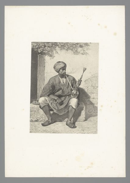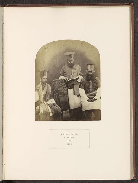 Curator: Before us, we have Christiaan Johan Neeb's "Portret van Laloe Soetawang," dating back to before 1897. This particular print is an albumen print, if you get up close you can appreciate the subtle sheen of the material. Editor: There's a stillness in this portrait, a certain formality. I'm struck by how composed Laloe Soetawang appears, yet something about his bare feet brings it all back down to earth—or to the studio floor, perhaps. Curator: The material reality here speaks volumes. Albumen prints were incredibly popular at this time, offering detail and clarity, but requiring an incredibly involved process. It would have required specific expertise, expensive chemicals, and darkroom knowledge. There’s a whole industry of labor hidden within that sepia tone. Editor: True. You can almost sense the weight of the process behind it, how those chemical reactions came together. The photograph also seems so poised to engage in the problematic conventions of orientalism...yet Laloe's gaze holds a strength that resists easy exoticization. It asks you to reconsider those tropes, no? Curator: Absolutely. Though Orientalism informs the perspective and availability of such works, it is compelling to view photographs that challenge imposed hierarchies and reveal resistance. There are visual and performative dynamics that communicate a self-authored representation within a visual culture often determined to diminish the agency of colonized peoples. Editor: I wonder about Laloe’s attire, too. The detail in the brocade jacket, set against the plain background...it invites so many narratives, what he’s communicating, how he saw his place in a shifting colonial landscape. This contrast is powerful. Curator: Absolutely. Photography’s ability to freeze a moment grants these sartorial decisions immense significance. The care taken in his presentation transcends simple documentation, gesturing toward deeper themes of cultural preservation, resistance, and personal identity construction amid cultural displacement. Editor: You have broadened my experience with an array of historical insights. Now, reflecting back on what the image evokes... There’s a quiet power here, a reclaiming of the gaze within what were then, very strict boundaries. It gives the portrait its lingering presence. Curator: Indeed. When you let go of preconceived notions about genre and provenance, "Portret van Laloe Soetawang" emerges as an arresting commentary about individual and collective will amid societal forces of oppression and inequality.