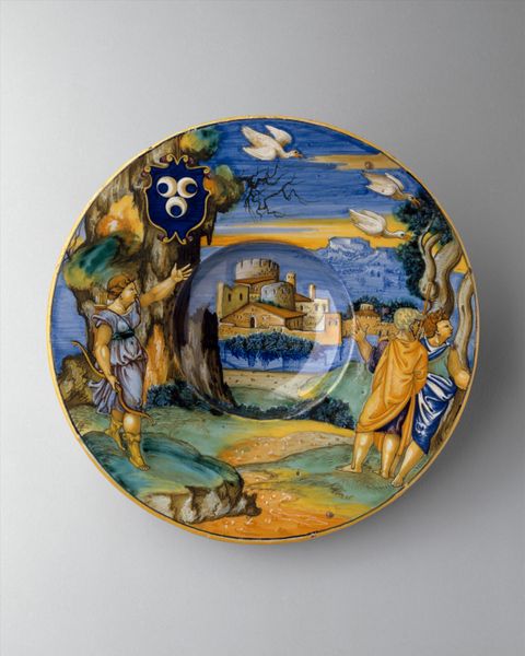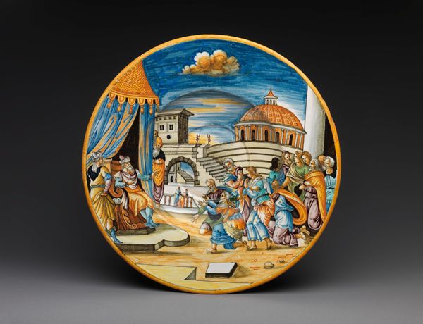 Curator: Welcome! Today, we’re examining "Plate with Jacob Is Shown Joseph’s Coat," a maiolica piece crafted by Gironimo Tomasi sometime between 1555 and 1580. It resides here at the Metropolitan Museum of Art. Editor: It's strikingly rendered. The compressed space really amplifies the emotion of the scene. Such an expressive moment captured on ceramic—it really stands out! Curator: Precisely. What's compelling here is that it elevates a functional object to the level of narrative art. This plate would have been created by layering different colors of glaze on the ceramic surface, then firing it in a kiln to produce its durable finish. Think of the specialized labor needed. Editor: Absolutely, and those layers vividly bring the biblical story to life. We see the distraught Jacob in the foreground, his dramatic reaction to the deceitful presentation of Joseph's bloodied coat by his brothers. It powerfully communicates themes of deception, loss, and paternal grief. Curator: Considering its original context is key here. Was it displayed or actually used for eating? Either way, consumption—both of the food and the image—becomes linked. The craftsmanship demonstrates both skill and the values of the patron. The materiality is intrinsic to its status. Editor: And the careful staging is full of import. The arched background draws our eye to some lone figure exiting out. I also can't overlook how Joseph's coat is not just any coat; its bright, distinctive colors symbolize Jacob's favoritism—a key motivator for the brother’s actions. It signifies love, privilege and ultimately betrayal. Curator: Good point! Looking closely, we can notice wear and repair to the glaze and surface, marking a tangible history of use and handling. It's fascinating how its preservation through time also speaks to shifting ideas about value—from a useful object to a collectible artifact. Editor: Right, the story lives on as this object remains, embodying those raw emotions across the centuries. Its durability becomes almost a defiant act, standing against oblivion and attesting to our need to retell our dramas. Curator: Ultimately, considering the intersection of material production, skill, and the evolution of cultural perception illuminates the full value of a piece such as this. Editor: Yes, and how powerful symbols, rendered with such visceral clarity, help preserve cultural memory—even when etched on humble clay.