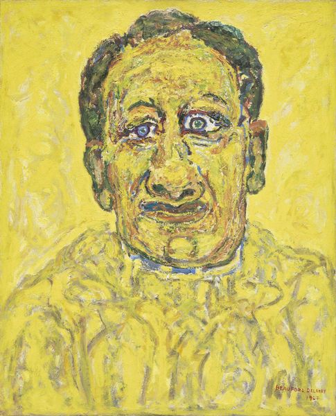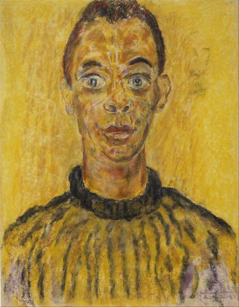 Curator: Up next we have Beauford Delaney's "Portrait of James Baldwin," executed in 1945. What's your first impression? Editor: Startling. The gaze is direct, almost confrontational, and the colours, though muted, feel… charged. Curator: I'd agree. The unusual colour palette - that almost greenish skin tone and those amber eyes - lend it an unsettling yet intriguing aura. Consider the historical context: 1945, Baldwin a young man navigating a racially charged America, Delaney an established artist exploring identity through modernist expression. Editor: It's difficult to separate the sitter from his later legacy. You can already see an intellectual intensity in Baldwin's eyes, a burning awareness. But looking at Delaney's technique – the thick impasto, the broken colour – I'm drawn to a deeper interpretation. Delaney may be revealing more than just Baldwin's outward appearance. Curator: Exactly. I see those broken brushstrokes as symbolic, almost fracturing the image. Is it a representation of the social fragmentation Baldwin would so powerfully address in his writing? Are we looking at more than just a likeness? Editor: Potentially, though the social lens interests me more directly: an older, Black, queer artist painting a portrait of the young activist, both battling their places in America. A touching intergenerational passing of the baton is presented. It is a potent statement by its very existence. Curator: Certainly. Artistically, note how Delaney renders Baldwin's humanity while defying traditional portrait conventions. His decision to use jarring greens, yellows and browns disrupts any idealized image, pointing towards an inner psychological reality. It is the visual equivalent to what James Baldwin was accomplishing with words. Editor: Right, it's a bold, challenging piece. It refuses easy interpretation, mirroring the complexities of identity and social injustice that both men grappled with. What a story is woven into the brush strokes of the work. Curator: It encourages a deeper look, that is certain. Editor: Indeed. It makes one consider that cultural memory endures most profoundly not only when voices break through, but when a portrait like this amplifies them through time.