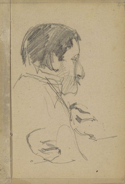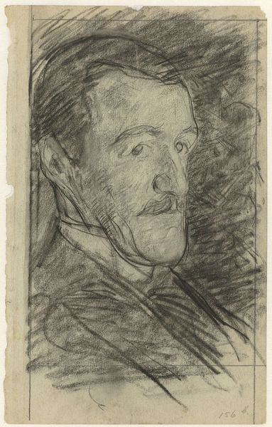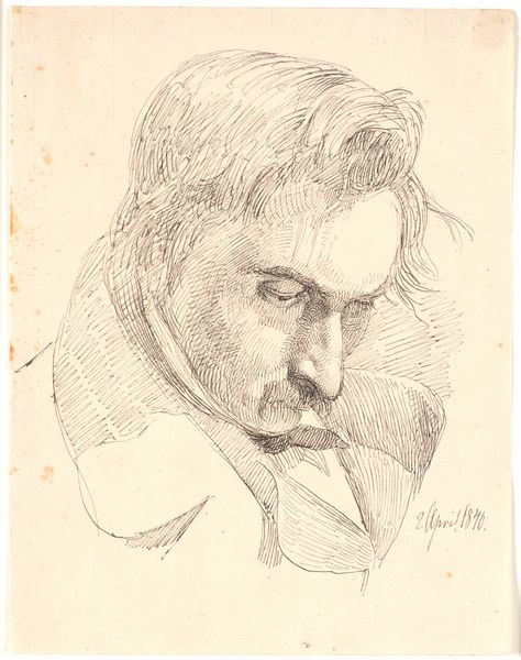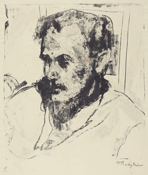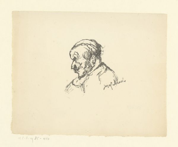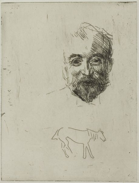 Curator: Looking at this striking etching from between 1927 and 1929, we see a portrait by Alfred Simonsen. It’s titled "Portræt af Kaj Eistrup" and resides here at the SMK, Statens Museum for Kunst. Editor: There’s an incredible stillness here, almost melancholy. The man’s head is bowed, lost in thought perhaps? It feels intensely personal. Like catching someone in a private moment of reflection, you know? Curator: Absolutely. Portraits, especially during this period, often served more than just commemorative functions; they were statements of identity and social standing. Here, however, there’s a certain ambiguity, maybe even a deliberate subversion of those traditional power dynamics. Editor: I love how the artist uses the etching technique. The cross-hatching gives it texture and depth, like you could reach out and feel the stubble on his chin or the weight of his thoughts. And the minimal background really throws the focus onto the face, all the lines drawing my eyes in. Curator: Etching as a medium does have its own fascinating history too. It allowed artists to produce multiple impressions, which democratized access to art in a way that painting simply couldn't. But it's equally about control, allowing for nuanced control of light and shadow, that cross-hatching to build form. Editor: It’s like whispers on the paper, revealing the person gradually. The downward gaze does pull you in. I feel his vulnerability, not grandeur. Makes you wonder, what was going through his mind as he was being drawn? What did Simonsen see in Eistrup? Curator: These works existed within a specific social and artistic framework. Examining the political climate, and perhaps knowing more about the subject of the portrait – his role and social interactions in the artistic community in Copenhagen would illuminate so much more for us about the intent. Editor: It's amazing how just a few lines can evoke such depth. A quiet intensity, an unburdening even, of the portrait's traditional ego. It invites us to contemplate not just the subject but our own internal landscapes, no? Curator: Exactly. So it’s more than likeness or representation, it is the historical narrative being conveyed by both the subject and creator in a wider cultural context. Editor: A simple but stirring slice of life caught with gentle lines. Curator: A testament to art’s reflective capability, isn't it?