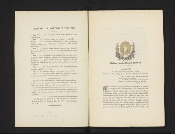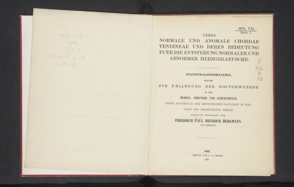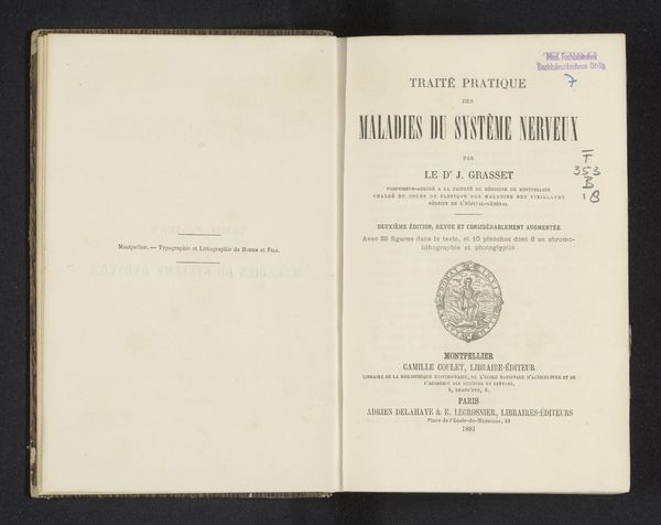 Editor: So, this is the title page from *Lessons cliniques sur les maladies mentales professées à la Salpêtrière*, dating back to 1876. It's a printed page, typography really the core medium here. The formality of the layout is striking. What can you tell me about it? Curator: Looking at this title page, I immediately consider the sociopolitical context. Salpêtrière was a famous hospital, especially known for its treatment of women deemed "hysterical". So this isn't simply a medical text. It's participating in a visual culture that shaped, and perhaps distorted, the perception of mental illness, especially for women in the 19th century. Consider the academic style in which it’s rendered, like the contents themselves, the information had to follow very strict regulations for that time. How do you feel that shapes our perception of it today? Editor: It's a very institutional look, isn't it? Legible, clear, everything in its right place. It feels like power being exerted through the very page itself, framing what is considered scientifically "legitimate". So much is in how this information is laid out, the structure of a title page from a certain kind of school in Europe… how might the choice of typography reinforce these ideas? Curator: Exactly. The typography here reinforces the image of scientific objectivity and authority. Each line is neatly centered, authoritative. And the inclusion of "avec photographies, planches lithographiques" also brings in another layer: supposedly objective visual documentation, that, combined with authoritative language creates a certain perception. Editor: It’s chilling to think how this visual framework legitimized potentially harmful practices. It also gives context to these types of works. It all felt separate but now the layers of social context gives this whole art piece a greater role. Curator: Precisely, and remember, the 'public role' of art extends even to something as seemingly straightforward as a title page. Thank you for your excellent insights!