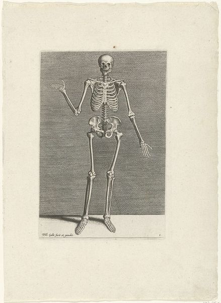 Editor: This etching, "Homo Homini Lupus" by Georges Rouault from 1926, has such a stark and haunting quality. The skeletal figure seems to smirk almost triumphantly amidst the skulls. What do you see in this piece, and how do you interpret its symbolism? Curator: It's fascinating how Rouault uses these stark contrasts to evoke such powerful feelings. The title itself, "Man is Wolf to Man," points towards a brutal assessment of human nature. Think of the skulls; they’re not just memento mori, reminders of death, but potent symbols of the consequences of unchecked human aggression. Do you notice how the figure, though skeletal, still holds a sense of power, even swagger? Editor: Yes, there's almost a celebratory air about it, which makes it even more unsettling. Like this figure is celebrating cruelty and human predation. Is that related to Expressionism? Curator: Exactly! Expressionism often grapples with the darker aspects of the human condition. The rough lines and intense emotional charge of the image pull us into the artist’s own feelings about a world driven by conflict. Consider how that dark background seems to swallow everything. What does that evoke in you? Editor: It feels like everything is collapsing, both literally and morally. I'm wondering, what can contemporary viewers take away from this almost century-old statement on human nature? Curator: The symbols Rouault employed are timeless. This artwork serves as a constant reminder of the darkness that exists within us and the importance of resisting our more destructive tendencies. Perhaps recognizing these patterns helps us avoid repeating them. Editor: That makes so much sense. It’s a powerful reminder that art can hold a mirror to humanity, even its most uncomfortable truths. Curator: Indeed, and by facing those truths, perhaps we can aspire to something better.