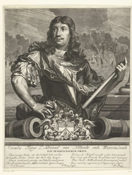 Bartholomeus van der Helst painted this portrait of Vice Admiral Aert van Nes, likely in Amsterdam sometime in the mid-17th century. During this time, the Dutch Republic was a major maritime power, and naval officers like van Nes were figures of considerable status. Consider the details in the painting: van Nes is richly dressed, with an ornate sash and a large lace collar, indicators of wealth and status. A younger man, possibly a clerk, stands behind him, attending to the tools of navigation. Van Nes gestures out towards a seascape filled with ships, asserting his command over the seas. However, the painting also speaks to a very specific social order, reflecting the hierarchies of Dutch society at the time. Van Nes's prominence is directly tied to maritime power, which in turn facilitated the growth of the Dutch Republic. This power was often achieved through colonization and the exploitation of people and resources. The painting then is not simply a portrait, but also a statement about Dutch power and its complex relationship to global trade, wealth, and colonialism.