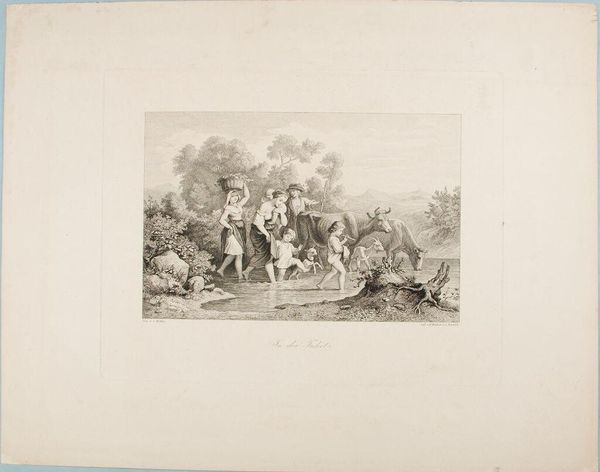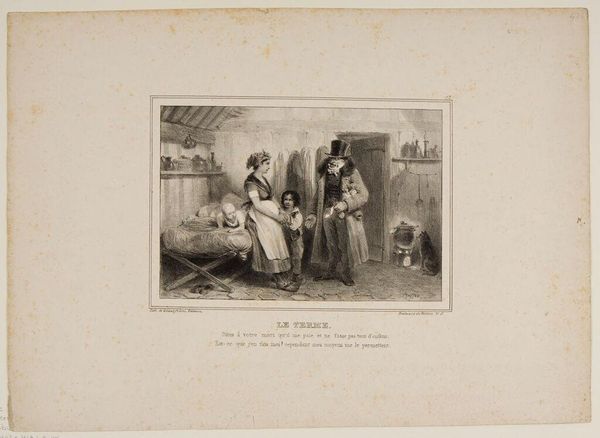 Curator: This is Nicolas Toussaint Charlet's "For Putting Butter on Beans." The setting seems humble; the figures radiate a jovial, almost theatrical energy. Editor: The linear precision is striking! The etching’s high contrast isolates the subjects, emphasizing their postures and expressions. It's a study in light and shadow. Curator: Precisely. Charlet often depicted scenes of military life and the working class. This image highlights camaraderie and the everyday rituals of nourishment. Editor: Note how the composition directs your eye – from the server with his buttered stick, to the grinning recipient. The receding background suggests a contained, intimate world. Curator: This speaks volumes about class and accessibility in 19th-century France, where food was never just sustenance, but a marker of identity. Editor: And yet, it transcends pure social commentary through its technical skill. The artist transforms a mundane act into an almost operatic moment through form and line. Curator: Indeed, it’s about recognizing dignity and humanity in the quotidian. Editor: I see it as Charlet elevating the commonplace through compositional rigor. Curator: A potent reminder that even the simplest acts contain profound narratives. Editor: A stimulating visual experience from a technical perspective!