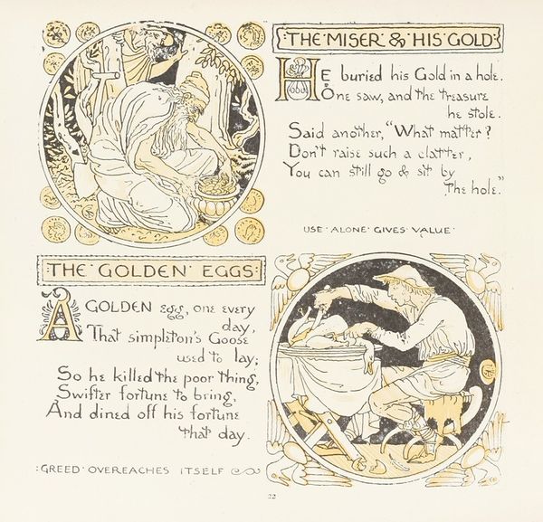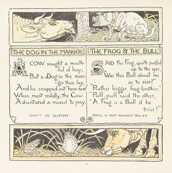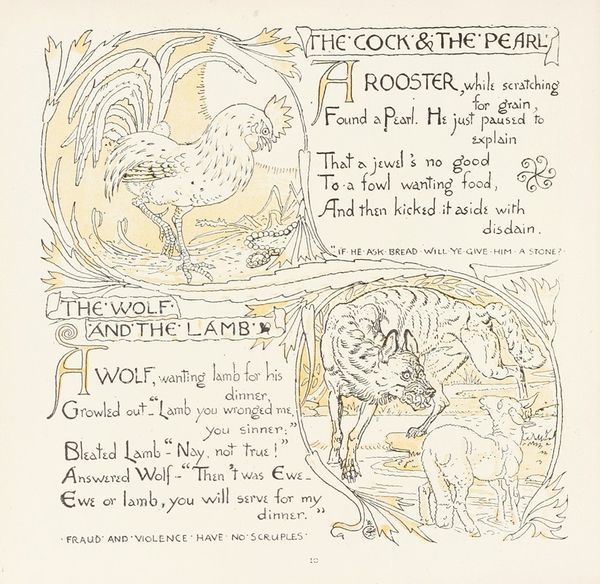 Curator: Here we have "The Oak and the Reeds, The Fir and the Bramble," a drawing created by Walter Crane in 1908. It’s rendered with pen, ink and subtle color washes on paper. Editor: Instantly, it makes me think of children's book illustrations. There's a whimsy to it, a delicate balance between image and text, almost like reading a page from a fable. Curator: Crane was heavily involved in the Arts and Crafts movement, which valued handmade goods and often incorporated moral or narrative elements. The piece illustrates two separate, paired allegories presented sequentially on the page, a common practice. Each reflects a distinct advantage between the mighty and the meek. Editor: I’m curious about the materiality of this drawing, it is somehow fragile yet durable. The fine lines suggest intricacy, almost an obsession with detail, while the overarching story is universal, timeless and kind. Curator: The artist would have been conscious of his material choices. Pen and ink, being easily reproducible through engraving, allowed for the broad distribution of these moral tales and perhaps democratized art. Crane understood the interplay between production and audience. Editor: I agree; it emphasizes its function as an instrument of communication. I also can’t help but consider how the themes are visually presented. The fallen oak dominating half of the picture versus the fir’s impending fate hint at the capricious nature of power and the irony in pride of place. Curator: Precisely, it's about understanding strength and resilience as it exists within social structures. Crane wasn't just creating beautiful drawings. He was also subtly critiquing societal values and highlighting labor and resilience in unexpected places. Editor: Beautifully put! For me, Crane’s sketch invites us to re-evaluate not just these fables but also the tools with which these age-old truths about fragility and hubris were created. It resonates far beyond just its lines and colours, echoing our current understanding of the precarious nature of power. Curator: Indeed, a delicate yet firm testament to the wisdom of adaptability, delivered through mindful craft and an eye toward distribution.