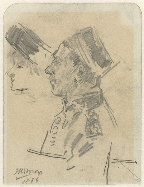 Editor: Here we have Manet's tiny etching, "Profile of Baudelaire Wearing a Hat." It’s so delicate and sparse, almost like a whisper. What do you see in this fleeting glimpse of Baudelaire? Curator: It's a mere breath, isn't it? Yet, within those few lines, Manet captures Baudelaire's melancholic air, that dandy-esque pose concealing a troubled soul. The hat… a symbol, perhaps, of the poet's attempt to both fit in and stand apart from Parisian society. Editor: So, the hat is like a mask? Curator: Maybe. Or maybe it's just cold! But it speaks volumes about their friendship. These two rebels, kindred spirits in a world they both loved and critiqued. Editor: I never thought such a small image could say so much. Thanks for that insight! Curator: My pleasure! Art often speaks in whispers. We just have to listen closely.