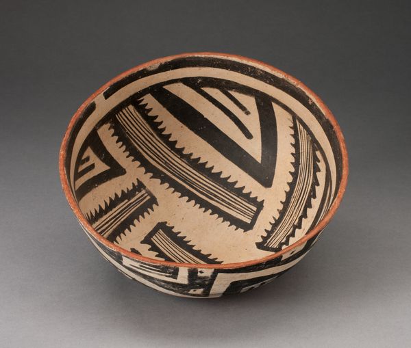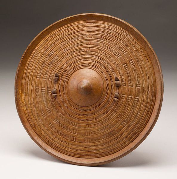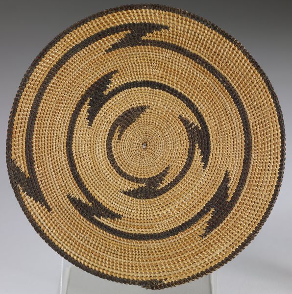 Curator: Here we have an Apache basket, likely created in the early 20th century. It’s part of the Minneapolis Institute of Art’s collection. Editor: Right away, I'm drawn to the sheer patience embedded in this piece. Each coil a testament to dedication. It's mesmerizing. Curator: Absolutely. Think about the indigenous Americas, and how geometric designs often weave in not just aesthetics but complex narratives, even cosmologies. What stories do you think these repeating patterns are trying to tell us? Editor: Well, circles are nearly universal symbols, right? Eternity, the cycles of life. The star-like burst at the center could signify connection, community, the weaving together of individuals. But those diamond-shaped figures—are those eyes? Are they watching? Curator: Interesting thought! In Apache tradition, certain geometric designs were believed to provide protection. I wonder if that "IBX" stitched into the side holds similar meaning. Editor: It does shift the energy slightly, doesn’t it? Introduces an individual maker’s mark, or perhaps an owner’s identifier. Takes it out of pure ritual object, perhaps moves it closer to personal expression. The brown against the muted background adds so much depth and intrigue. Curator: It's fascinating to see these intersections of cultural expression and possible external influences. Baskets, especially those made by indigenous communities, become containers not just of physical items, but of complex stories. Editor: It is a beautiful object. In it I think one can see both personal and cultural stories subtly intertwining. It leaves a gentle yet lasting impression. Curator: A truly stunning piece that speaks volumes in the visual language of tradition and craftsmanship.