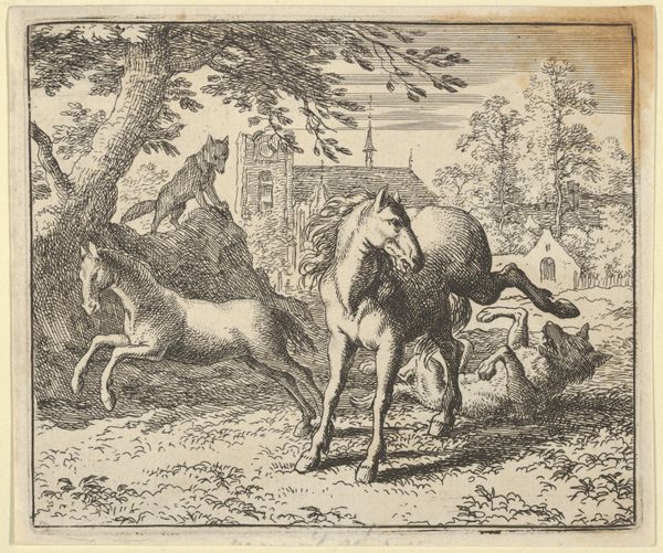 Curator: Allow me to introduce "Ragotin Holds onto the Bucking Horse," an engraving by Daniel Nikolaus Chodowiecki, dating back to 1782. It's currently held in the collection of the Rijksmuseum. Editor: Oh, it's got that delightfully frantic energy. You can almost hear the clatter of hooves and the panicked yells. What's Ragotin holding on for dear life to? Curator: Ragotin is a character borrowed from Paul Scarron's novel. And I think the image brilliantly embodies a sort of chaotic comedy—he is in that carriage, but the horse... well, it has its own ideas. Editor: Absolutely. Horses have always symbolized raw power, but here it feels more like untamed ego. And the way everyone's crammed into that carriage, each with their own reaction… there's a whole society on display in that one bouncing vehicle. Curator: Precisely. Chodowiecki uses a wonderfully delicate line to depict the scene, which emphasizes the fragility of the moment, right before total pandemonium erupts. You get the impression that something truly riotous is right about to happen. Editor: And the landscape around them—almost serene in its stillness—provides such a wonderful counterpoint. It's like a stage set for the unfolding drama of human and animal wills colliding. Almost mocking, I think. The futility! Curator: Symbolically, the horse is disrupting the carriage's journey, you know, the societal "path," you might say, which reflects, in my mind, this period of change where old ways were bucked with... vigor. It speaks to the tensions bubbling beneath the surface of late 18th century Europe. Editor: Right. That's why these carriages are such fascinating images to me, these vehicles are symbols of progress and also imprisonment at the same time. And of course a lot of people felt thrown from them, especially then. Curator: I appreciate your insight. Looking at this piece again, I see it as not just a funny scene but a commentary on the disruptive force of the unexpected in our lives, the times when our vehicles buck us off. Editor: Well, I’ll just hope the image reminds me to have a soft grip on those reins, whatever carriage I may find myself in!