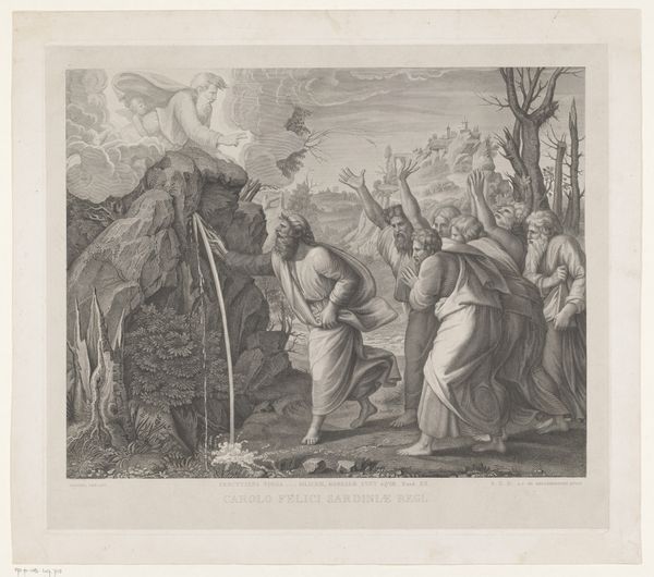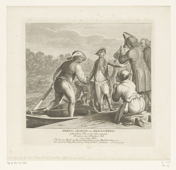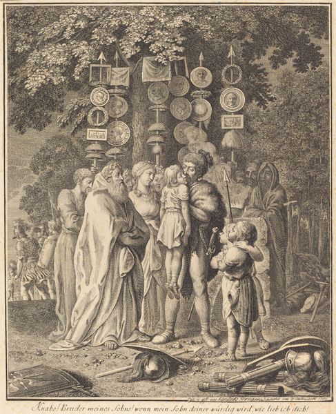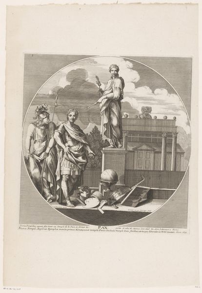 Editor: Here we have "Concordia," an engraving dating between 1663 and 1716 by Jacques-Antoine Friquet de Vauroze. It's rendered in the old engraving style, all these very fine lines creating a scene of figures in classical dress. What draws your eye, what patterns or relations do you see within the composition itself? Curator: Notice how the artist organizes the composition using linear perspective, directing the viewer's gaze towards the handshake at the center. This creates a focal point emphasizing the concord, or agreement. What of the contrasting groups of figures on either side of the handshake, do they imply an element of discord? Editor: Yes, absolutely. The soldiers on the left versus the winged figures on the right creates an interesting contrast. It also occurs to me that the architectural elements visible behind them appear distinct. Curator: Indeed. The engraving’s symmetrical arrangement reinforces the concept of balance and harmony. Consider the use of light and shadow. Note the cross-hatching employed to create depth. This element enhances the texture and volume of the forms, providing a tactile quality. Editor: I see that. So much detail emerges from this network of lines. I wouldn't have thought about texture in an engraving, but I see how it guides my perception of the scene. Curator: The octagonal border further emphasizes the artwork’s internal structure. This rigid geometry serves to contain the fluid forms within the central image, producing tension, and also implying boundaries. Editor: It is almost as though the artist wants to define this concept, ‘Concordia,’ as something structured rather than free. I didn't really consider that before! Curator: The artist invites viewers to contemplate not only the allegory but also the formal techniques used to convey it, from the visual weight created with lines, the structural tension in the scene, and the texture created. This artwork is full of lessons.