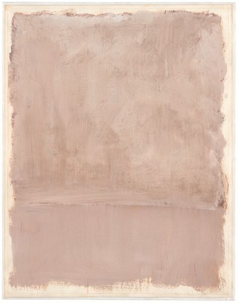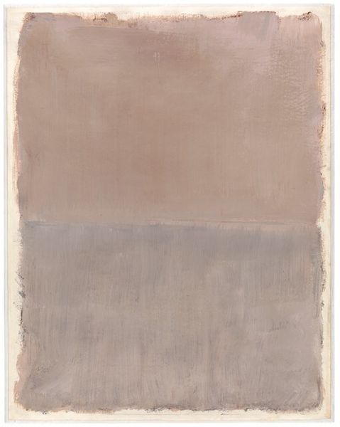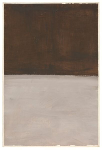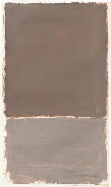 Editor: We're looking at an oil on canvas, "Untitled (brown and gray)" by Mark Rothko, from 1969. It’s basically two blocks of colour, brown over grey, simple as that. But there’s something somber about it, like a darkening sky. What do you see in this piece? Curator: I see a potent example of how Rothko engages with the evolving cultural landscape of the late 60s. Think about the social unrest, the Vietnam War protests. He moved away from the vibrant hues he was initially known for to these darker palettes in his final works, often interpreted as reflecting a growing sense of unease. Do you see how the simplicity actually amplifies its impact? Editor: I do, now that you mention it. It's almost like the painting itself is protesting, using its visual weight. But it’s just colour, isn’t that a bit of a reach? Curator: But colour is never just colour. Rothko aimed for these paintings to be experiences. The monumental scale forces a certain physical engagement and proximity. He was incredibly specific about the lighting of these pieces as well. All this controlled exhibition plays directly into the artwork’s public role, its reception. And you must wonder why he stopped naming his works... Editor: Almost directing how it should be seen... like staging a feeling? Curator: Precisely! He's shaping a specific experience, one tinged with the socio-political anxiety that marked the end of that decade. Now, considering that, how does the greyscale contribute to that message? Editor: Wow, I thought it was just sad. But knowing that he purposefully wanted to induce such feelings because of socio-political tensions of that time makes it so much deeper and darker! Curator: Absolutely. Understanding the historical context reframes how we view the artist's choices, giving even shades of gray a powerful voice.