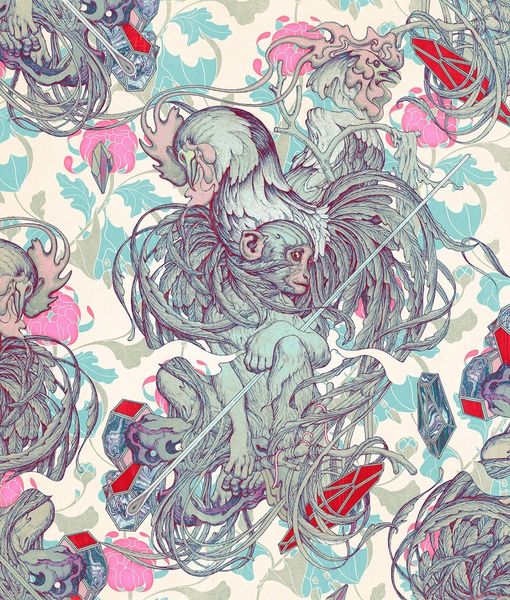 Here, James Jean conjures a world of tigers and foliage with a graphic, illustrative style. Look at the outlines—crisp and sure—that give form to the flora and fauna. It's like the artwork itself is caught in a dance between precision and wildness, a balance I always strive for in my own work. The material quality is really interesting, too. The surface seems smooth, almost like it's been printed, yet the colors are rich and deep. The tigers, peeking through the leaves, create a sense of depth within this flat space. The way the blue-green foliage contrasts with the orange and yellow stripes of the tigers reminds me of Japanese Ukiyo-e prints, a kind of visual conversation across time. Art is always a dialogue, right? Jean's Tiger II is a reminder that even in the most meticulously rendered images, there's always room for the unexpected, a space for us to wander and wonder.