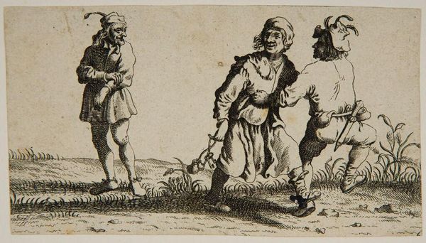 This print, "Two Dancing Farmers and One Watching," was made by Abraham Allard sometime around the turn of the 18th century. It's an etching, meaning that Allard would have used a sharp needle to draw into a wax-coated metal plate, which was then bathed in acid. The acid bites into the exposed lines, allowing for ink to be deposited and then transferred to paper. Look closely, and you can see the characteristic crispness of the lines, and also the burr created by the needle as it scrapes across the metal. The choice of printmaking as a medium is telling. It allowed Allard to create multiples of his image, which would have been relatively inexpensive and widely distributed. This aligns with the print's subject matter: everyday rural life. The image offers us a glimpse into the lives of ordinary people, their pastimes and social interactions. Considering the material and process of its making, this work bridges the gap between high art and popular culture. Allard's choice of etching, and his focus on everyday life, democratizes art, making it accessible to a wider audience and reflecting the social realities of his time.