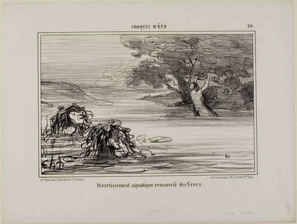 Curator: Here we have Honoré Daumier's lithograph, "Having had the unfortunate idea to go take a nap at the water's edge," plate 9 from his series "Croquis D'été", created in 1856. It's a print on paper, currently residing here at the Art Institute of Chicago. Editor: My initial reaction is one of exhausted amusement. There’s a dark, almost scratchy feel to the lithography, yet the scene itself is so relatable: that yearning for a peaceful nap outdoors gone completely wrong. Curator: Absolutely. And in considering the piece's historical context, we can note that Daumier often used his art to satirize bourgeois life in 19th-century France. Here, the title itself, "Having had the unfortunate idea...", drips with a relatable irony. I'm wondering, what is the dynamic between the figures portrayed? Editor: It is about gender roles. We see a man reclining, apparently trying to sleep, while the woman beside him is attending to him and maybe warding off insects, but not napping herself. Even in "leisure", women's labor is highlighted. It speaks volumes about the expectations placed on women. The darkness around the periphery creates an ambience of anxiety, reflecting not carefree bliss. Curator: It is interesting how he highlights the uneven distribution of relaxation! And thinking of Daumier’s other work for magazines such as *Le Charivari*, the political context is really key. In that respect it can be read as a depiction of broader anxieties around industrialization and urbanization impacting personal lives at the time. Even moments of leisure become fraught with a kind of performance for an implicit bourgeois gaze. Editor: And from an activist perspective, such representation reinforces existing inequalities in access to rest and relaxation, reflecting that even so called 'private moments' reinforce social inequalities and cultural expectation, thereby having further political and social repercussions. Curator: Well, I must admit I hadn't considered all of those gendered political issues surrounding relaxation! This lithograph certainly gives one much to contemplate about leisure. Editor: Indeed. It is about critically engaging with the artwork in relation to a world where such leisure may reinforce uneven gender relations.