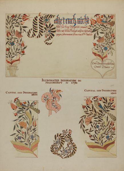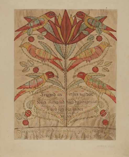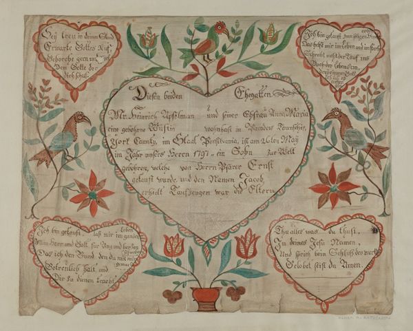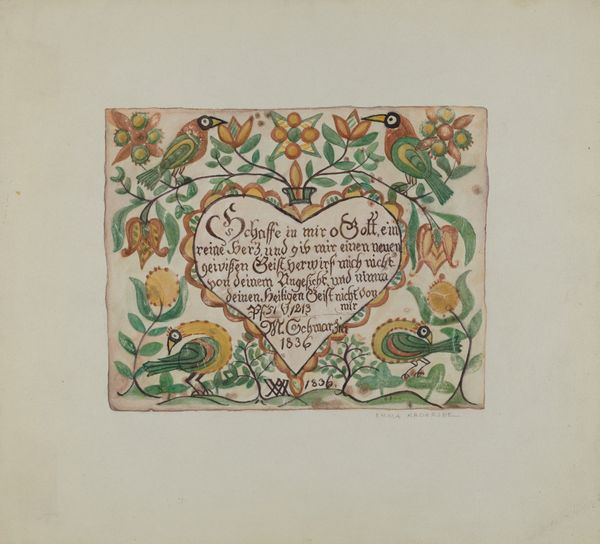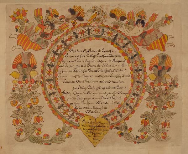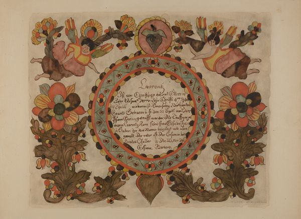 Editor: This is "Fraktur" by Richard Barnett, likely created between 1935 and 1942. It appears to be a print with watercolor and ink on paper, resembling a decorative document. I’m immediately drawn to the folk-art style and miniature details. What can you tell me about it? Curator: It’s interesting how Barnett revives Fraktur, a Pennsylvania German folk art form, so late – well into the 20th century! This connects to the broader history of American folk art, doesn’t it? There's a rediscovery of traditions during the interwar period, potentially as a way to reinforce cultural identity during times of rapid change and, globally, rising facism. How do you interpret the prominent use of text? Editor: I noticed the German script within the heart shapes and surrounding the central vase. The text seems integral, almost like the images are illustrating a story or a ceremony, maybe like a baptism or birth announcement. I was also wondering, who was this artwork meant for? Curator: Exactly! "Geburts- und Taufschein" translates to "Birth and Baptismal Certificate." Its public role served as important cultural document, formally recording major life events in a community. Considering that Richard Barnett's art revives this public record, one can ask why an early 20th-century artist return to this style? Who would be interested in buying a vintage rendering of what was already obsolete by then? The placement of angels and birds is conventional; have you noticed any atypical symbolism, perhaps reflecting contemporary sensibilities? Editor: That’s a fascinating detail! The style and subject feel so old world, that it’s really odd knowing this was made just before WWII. I hadn’t thought about it as a deliberate choice and potentially appealing to collectors looking for reminders of a specific ethnic and cultural identity. Curator: Precisely! Art is never made in a vacuum, but always speaks to—and out of—specific circumstances, so thanks for noticing. Editor: I will never see Folk Art the same way now. It’s not just about aesthetics but about preserving history.