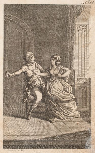 Editor: This is Louise Gaillard’s engraving, "To elskende, der bryder et brød," also known as "L'Amour Fixé," from 1770, here at the SMK. The figures, with their elaborate clothing and hairstyles, give it a definite Rococo feel. What's particularly striking is the moment they're sharing, breaking bread together. How do you read this piece? Curator: As a materialist, I see the broken bread not as mere symbolism of love or fidelity, but as a tangible element reflecting the economic realities of the time. Look at the detail in the costumes – the textiles, the tailoring. These weren’t accessible to the masses. What did it mean to produce and consume those materials? Editor: So, you're suggesting the act of sharing this bread, within that context, becomes… a demonstration of status, perhaps? Curator: Precisely. Bread, in 18th-century France, held significant economic weight. It's tied to agriculture, labor, trade… This simple act, reproduced through the medium of engraving - a process requiring skilled labor and specific materials - takes on a complex significance. It becomes an object of consumption itself. What processes do you think were required for an average citizen to get this engraving, displayed in their homes? Editor: Well, there's the artist's labor, the engraver's skill... And the materials: the paper, the ink... It highlights how even seemingly simple artworks are embedded in layers of production and social context. I hadn't considered the bread itself as part of that material network. Curator: It's all about unpacking the layers, from the pigments to the pastries. Everything speaks to a larger network. Editor: Right! Looking at art through the lens of materials and production reveals so much more than just aesthetic appreciation. Curator: Exactly, it exposes the socioeconomic foundations upon which art, and indeed society, is built.