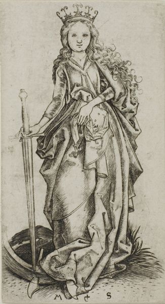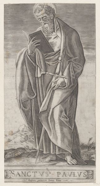Curator: This is "Johannes de Evangelist," a print by Israhel van Meckenem, created sometime between 1455 and 1503. It’s currently held in the Rijksmuseum. Editor: Immediately, the intricacy strikes me. The delicacy of the lines gives a quiet, contemplative feel. And that lamb! So meticulously rendered. Curator: Absolutely. As an engraving, it's fascinating to consider its production and reception during the Northern Renaissance. Prints democratized imagery, allowing broader audiences access to religious iconography and artistic styles. Van Meckenem, a prolific printmaker, played a significant role in that dissemination. Editor: Indeed. And consider the symbolic weight carried by John the Evangelist. Here, he's depicted with the Lamb of God – a potent symbol of Christ's sacrifice. The inscription on the banner echoes this, likely a variation of "Agnus Dei, qui tollis peccata mundi" – Lamb of God, who takes away the sins of the world. It's all so visually interconnected. Curator: What interests me, too, is how these images were circulated and understood within the social and religious contexts of the time. Did people readily grasp the theological nuances, or did the visual power of the image resonate on a more emotional level? Was it a personal devotional aid or displayed more publicly? These are the questions that come up. Editor: It likely functioned on multiple levels, simultaneously reinforcing religious doctrine and inspiring personal devotion. Notice how John’s hand gestures towards his heart. It's as if he's inviting the viewer to internalize the meaning of the lamb's sacrifice. Curator: It highlights how art in this period was far from passive. These were active tools. Engravings were used in everything from personal devotion to shaping civic identity. Editor: Exactly. Seeing those symbolic cues overlaid through careful drawing and rendering creates a unique and emotionally stirring visualization of Christian narrative, which is perhaps more broadly affecting to wider audiences. It reminds us that certain symbols stay relevant, yet take on fresh dimensions with each new rendition across the ages. Curator: Looking at this through both lenses reveals how artworks function not only as aesthetic objects, but as critical conduits of meaning.