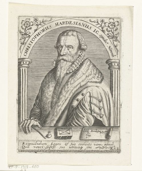 This is Theodor de Bry’s “Portret van kardinaal Pietro Bembo,” made sometime in the late 16th century. The print presents a portrait of the Cardinal, framed within an oval and set against a rectangular backdrop. The texture is created by fine, precise lines, giving depth and form to the figure and decorative elements. The composition emphasizes a contrast between organic and geometric forms. The soft curves of the floral ornamentation in the frame play against the strict lines of the lettering and rectangular cartouche. The overall structure serves to contain and define the Cardinal's image within a set of visual and textual codes. The careful arrangements of these elements, and the relationship between the lettering and the portrait itself, reflect an engagement with the Renaissance concern of integrating classical learning with visual representation. The image’s structure creates a sense of decorum fitting for a man of the church. Yet, the tension between the organic and geometric introduces a complexity of meaning.