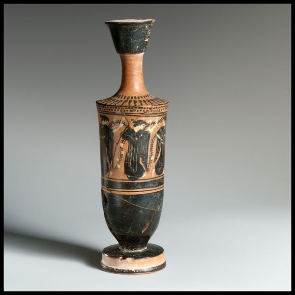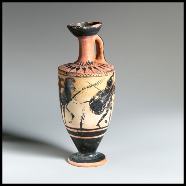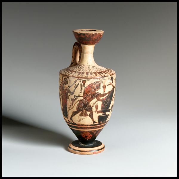 This Lekythos was created in Athens by the Class of Athens 581. It's a ceramic piece with a captivating narrative scene rendered in black figure technique. The vase's structure is neatly divided into registers. Notice the horizontal band that grounds the figures, providing a stage for their interactions, and the meticulous patterns above that accentuate the vessel's form. The contrast between the reddish clay and the glossy black paint creates a striking visual tension, emphasizing the contours of the bodies and the folds of their garments. The composition guides our eyes through the scene, from one figure to the next, inviting us to decode their gestures and expressions. The use of line is particularly effective, defining shapes and conveying movement, capturing a moment of ancient Greek life. The lekythos, beyond its utilitarian function, serves as a canvas for exploring representations of the human form and social narratives. As a cultural artifact it allows us to consider the intersections between art, daily life, and the stories we tell ourselves.