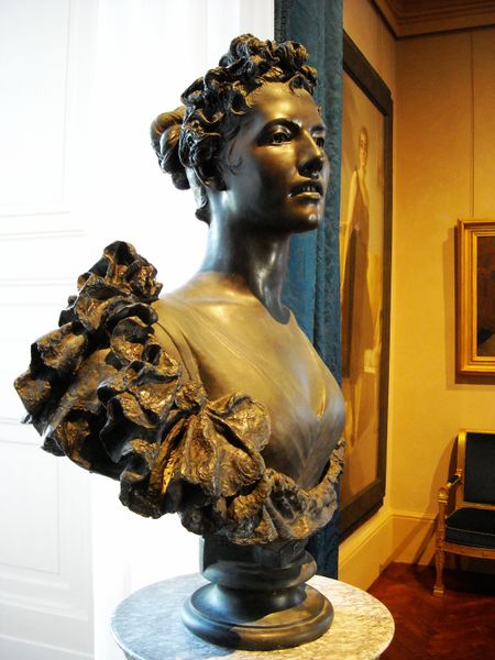 Editor: This marble sculpture is entitled “Portrait of Berta Hassler” by Filippo Cifariello. What strikes me most is how the rigid material seems to contradict the softness of her ruffled dress. What do you see in this piece? Curator: Well, looking at this piece, I see more than just a portrait. We need to consider the gaze. How does it engage with or resist the viewer? Does it challenge or reinforce societal expectations of women, particularly in relation to class and power during the period it was made? Editor: That's a very different way of considering portraiture than what I'm used to! Are you suggesting the sculpture is commenting on Berta Hassler's position in society? Curator: Precisely! The fact that she could commission such a work speaks volumes about her status. Consider the context. Realism, especially in marble, carries associations with power and permanence, harking back to classical ideals, often used to immortalize those in positions of authority. Yet, does the softness of the dress subvert those classical themes? What does this tension communicate? Editor: I guess I was too caught up in the beauty to think critically about the message of the work itself. The softness feels almost subversive when you consider the history. Curator: It's about questioning what seems natural or given. Did she have agency in the creation of this representation? Did Cifariello’s decisions have the ultimate influence, or did she want to be portrayed a particular way, and why? That would involve exploring gender and agency at that time. Editor: So, reading between the lines of a sculpture! That really changes my perspective. Curator: It is less about the aesthetic appeal and more about interrogating the layers of meaning embedded within the artwork and thinking critically about its social and historical implications. Editor: Now, I will look at art through the lense of cultural background. Thanks for widening my horizons!