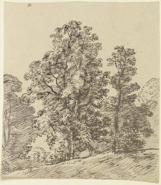 Editor: Here we have "Forest Section," a drawing of trees made with pencil, chalk, graphite, ink, and etching by Roelant Roghman, its date is unknown, but it can be found in the Städel Museum collection. The starkness of the drawing makes the piece feel lonely, almost desolate. What can you tell me about it? Curator: It is interesting that you sense loneliness here, given that landscape art of the Baroque era served a vital social function, linked to emerging national identities and land ownership. Roghman’s detailed rendering reflects the growing Dutch pride in their reclaimed landscapes. Who, after all, had the right to claim or depict this scene? Editor: So the picture claims something? How do you see this playing out in "Forest Section" particularly? Curator: Precisely! Think about it: what does the style do, and who can afford this artwork and the associated status that comes with it? This detailed style showcased dominion over, and understanding of, the land. Owning it became a political act of displaying Dutch wealth and mastery. Roghman democratized art by way of printmaking for wider appeal. It offered a pictorial assertion of control over nature. Editor: I never would have considered that such a simple sketch could convey this complex political message. Curator: Exactly! It invites us to ponder the relationship between art, power, and environment, then and now. What responsibility do artists have to shape public perception? Editor: I will be considering how landscapes can embody historical power structures moving forward!