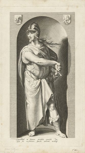 Editor: Here we have Jacob Matham's engraving, "Vrede," from 1593. The figure strikes me as severe, almost imposing, with a rigidity to the lines that makes the figure look rather cold. What formal elements stand out to you? Curator: Indeed. Let's consider first the interplay of line and space. Observe how the dense hatching behind the figure pushes it forward, emphasizing its solidity and presence. What effect does this stark contrast achieve in your estimation? Editor: It definitely highlights the figure's form, giving it weight, almost sculptural quality. But it also creates a very limited depth of field; there's nowhere for the eye to really rest except on the figure itself. Curator: Precisely. Furthermore, note the positioning of the figure within the arched frame. How does this contribute to the overall composition? Editor: The arch almost acts like a spotlight, doesn't it? It emphasizes her centrality and heightens the sense of monumentality, despite being just a print. I'm also interested in how the lines seem to suggest musculature and form, but almost in an exaggerated, stylized way. Curator: Yes, and this exaggeration aligns perfectly with Mannerist sensibilities. The lines are not merely descriptive; they contribute to a sense of artificiality, perhaps even anxiety, beneath the surface. Now, what observations might we offer regarding the gaze and hand gestures of the figure? Editor: Her intense gaze and firm grip on the sword definitely reinforce the image's sense of authority, maybe even latent violence despite it being Vrede. It almost feels contradictory, the harshness undermining any traditional notion of "peace." Thank you for helping me break down how the composition really drives home that tension. Curator: A very astute reading! We’ve illuminated how line, composition, and even gesture can create this fascinating friction, and these choices reveal much about the period in which this print was crafted.