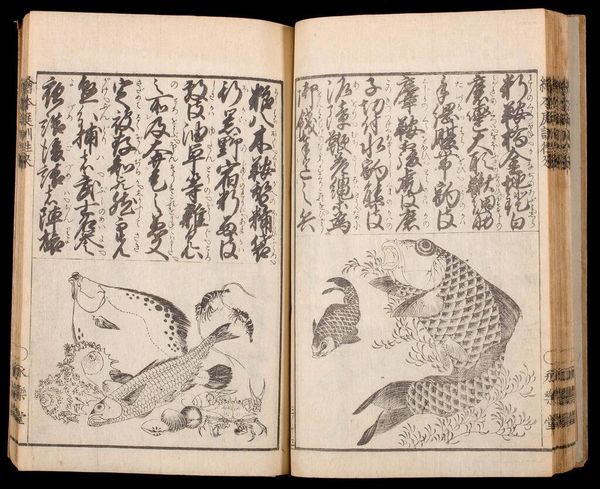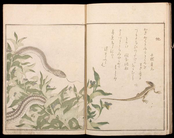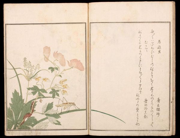 Curator: Here we have volume seven of Nakamura Tekisai’s "Great Illustrated Encyclopedia, Revised and Enlarged." Look at these delicate depictions of insects. Editor: My first impression is one of stillness, a kind of entomological tranquility. The composition is spare, yet somehow teeming with life. Curator: It’s remarkable how these encyclopedia illustrations functioned in society, standardizing knowledge and shaping perspectives on the natural world. Editor: Absolutely. The dragonfly, for example, often symbolized summer and change in Japanese art. I wonder what cultural nuances these insects carried for viewers at the time? Curator: Considering the rise of natural sciences during the Edo period, it’s possible they reflect a growing desire to classify and control nature. Editor: Perhaps. Or maybe it's the simple enduring fascination with the miniature dramas playing out in our gardens. Curator: Yes, a vital reminder that the pursuit of knowledge is always influenced by social and cultural currents.