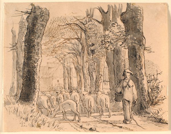 Curator: Let’s consider this landscape genre scene rendered in ink, entitled “Vogterdrengen,” or “The Shepherd Boy,” dating to 1845, created by Adolph Kittendorff. My first impression is one of intimacy. Editor: Yes, there is an interesting focus on the structural elements that pull the viewer in. The strong verticals of the trees frame the narrative and direct the eye along the path. I also see contrasting textures. Curator: I think this drawing opens a discussion on the relationship between childhood, labor, and the idealized rural life prominent during the Biedermeier period. We have this young shepherd boy positioned almost as a mediator. His simple garb, coupled with the presence of livestock, points to the economic realities of the time, particularly childhood labor practices in rural communities. The very fact that his identity seems linked so fundamentally to this singular economic purpose... Editor: But look at the composition. Notice how the lines, thin yet deliberate, construct form and define space, creating this visual rhythm leading into depth. Curator: This kind of artistic decision creates a sense of harmony with nature, perhaps softening the starker realities. Think of the legacy of pastoral narratives… the use of nature to perhaps obfuscate underlying issues. The lack of any individualized features to the subject, making him representative. Editor: Indeed, the textures almost create this haptic quality, encouraging the viewer to visually “touch” the trees and feel the earth beneath the boy's feet. This engages multiple senses beyond just sight, doesn’t it? Curator: To move toward this engagement while glossing over very tangible exploitation is a complicated element here, isn’t it? Overall, the image gives insight into the economic roles thrust upon children in 19th-century rural settings. Editor: Well, whether we consider the visual language or its societal narrative, this drawing by Kittendorff serves as a captivating intersection of artistry and socio-historical context. Curator: Precisely, understanding its dual commentary enables us to more richly perceive art's power in society and reflect on social accountability today.